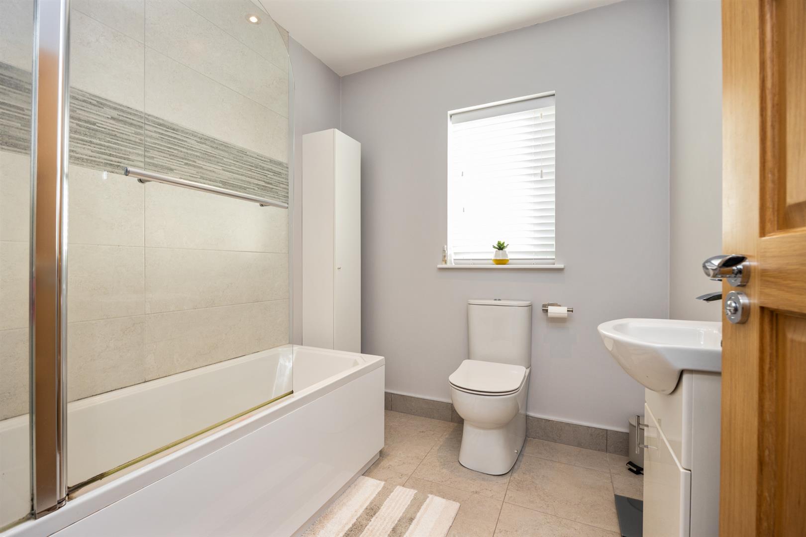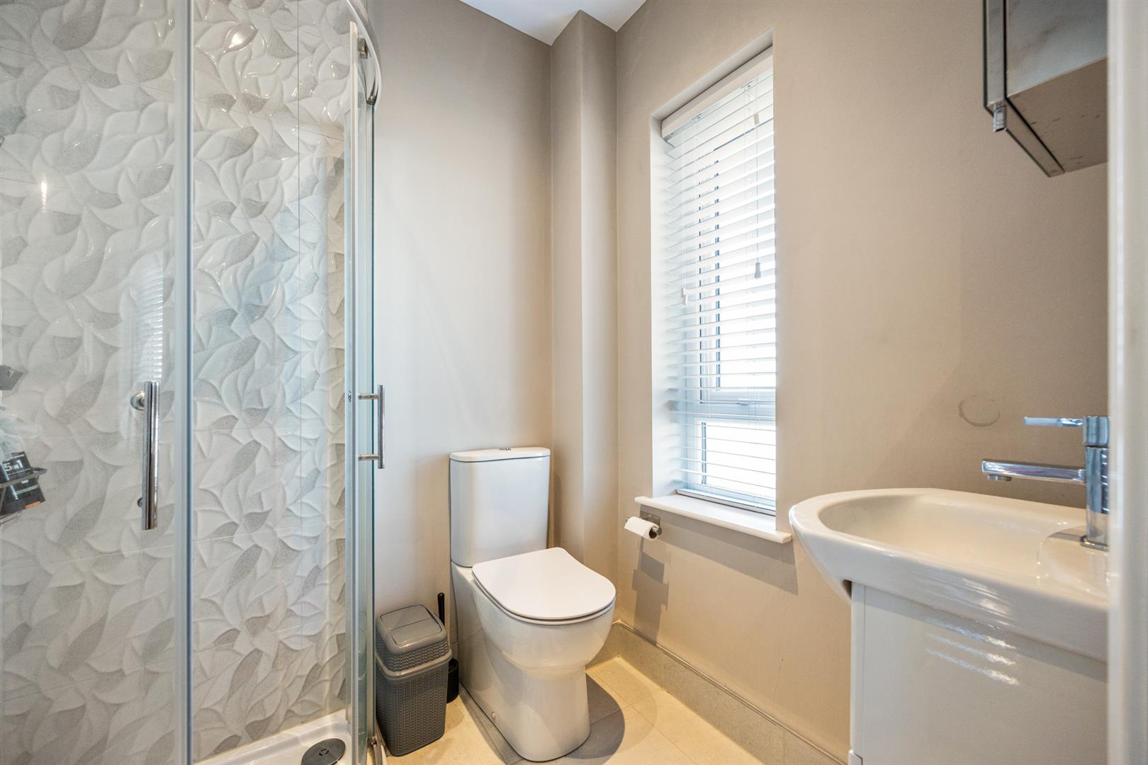 Shower cubicle, vanity unit, low flush w.c, tiled at splashback. Window to front.