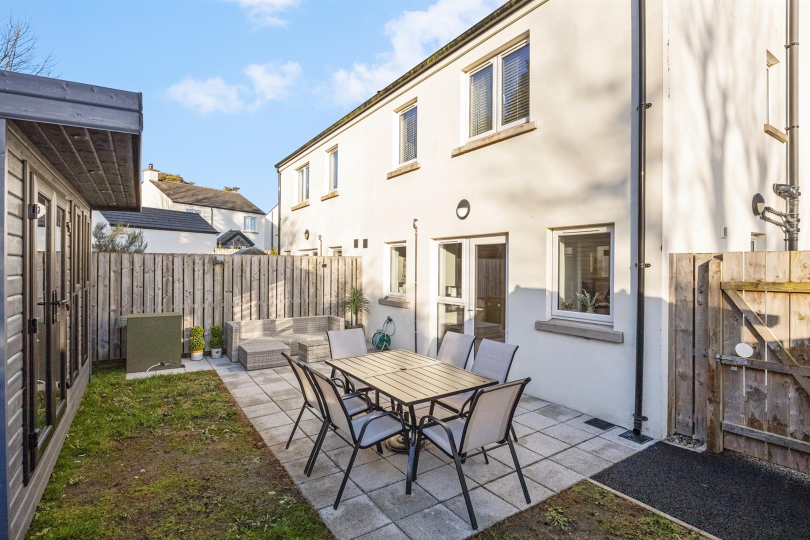 Tarmac driveway to the front with gardens in lawn with enclosed rear gardens in lawn with paved patio area and garden room.