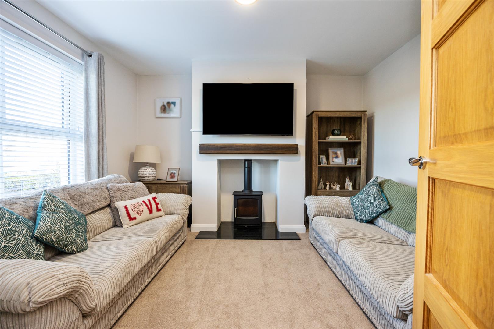 Wood burning stove on tiled hearth with floating mantle beam over. Window to front, fireplace, door to: