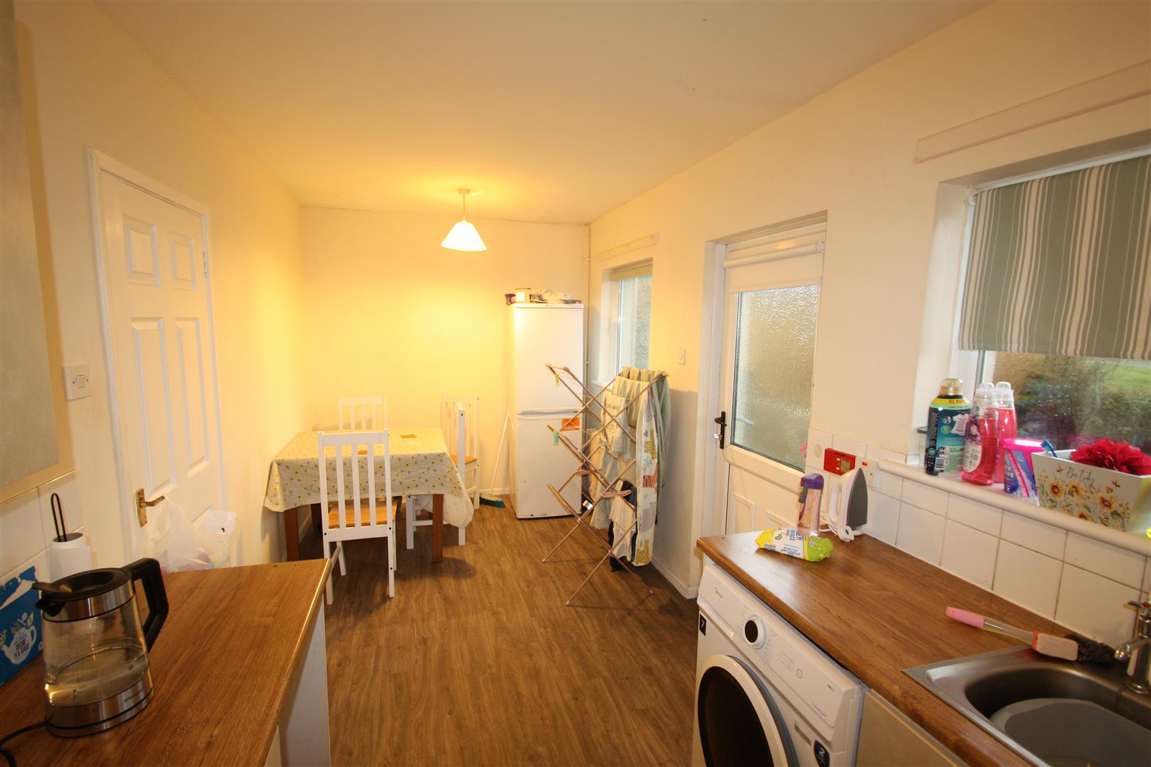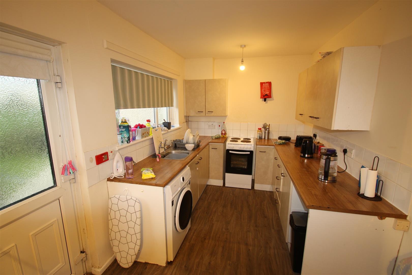 A range of high and low level units including stainless steel sink unit and single drainer, recess for oven and fridge. Tiled at splash area and door to rear.