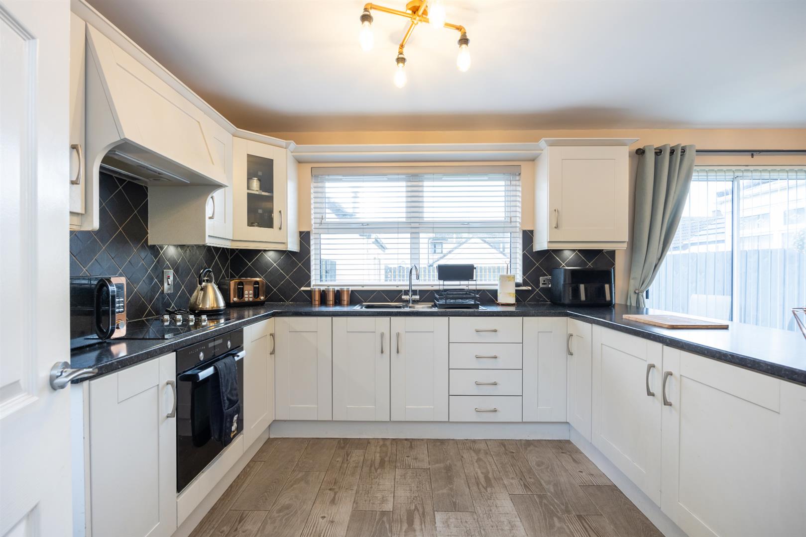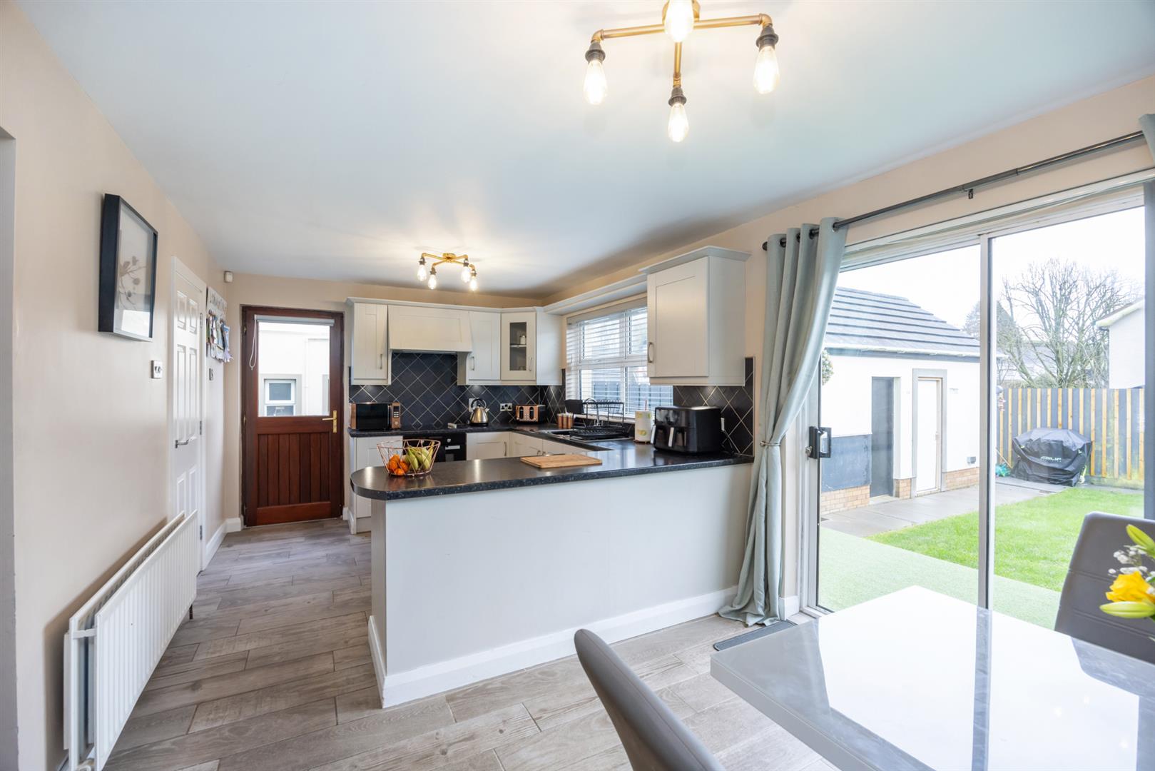 High and low level units with 1 1/2 stainless steel sink unit. Integrated oven, hob and dishwasher. Tiled at splashback Tiled flooring. Window to rear, sliding door to rear garden, door to: