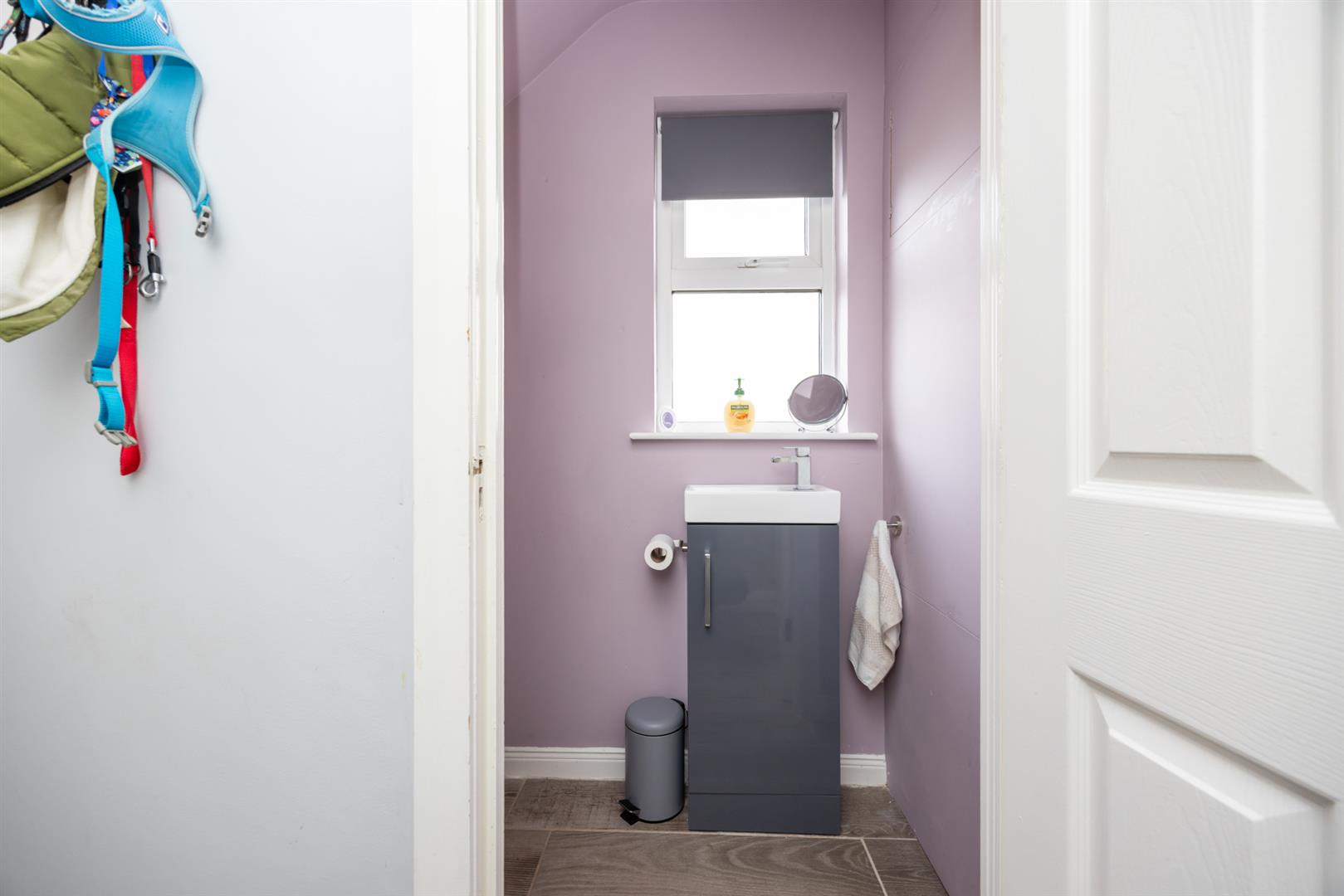 Tiled floor. Vanity unit and low flush w.c. Window to side, door to: