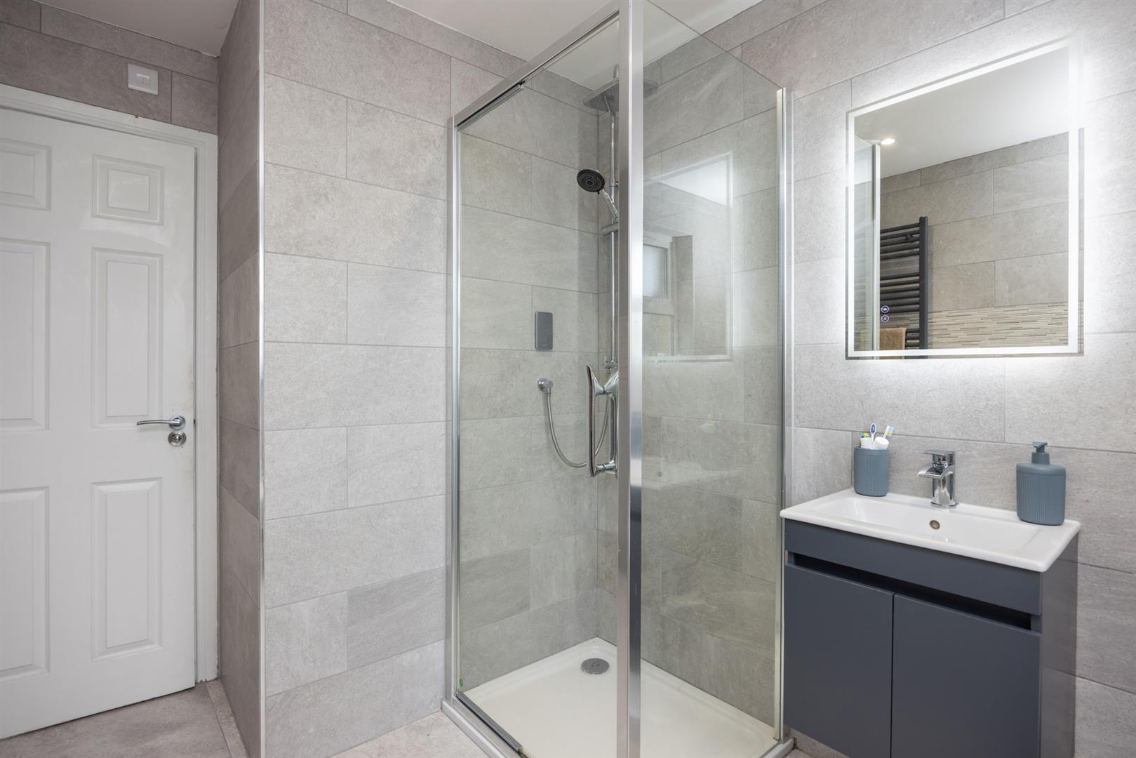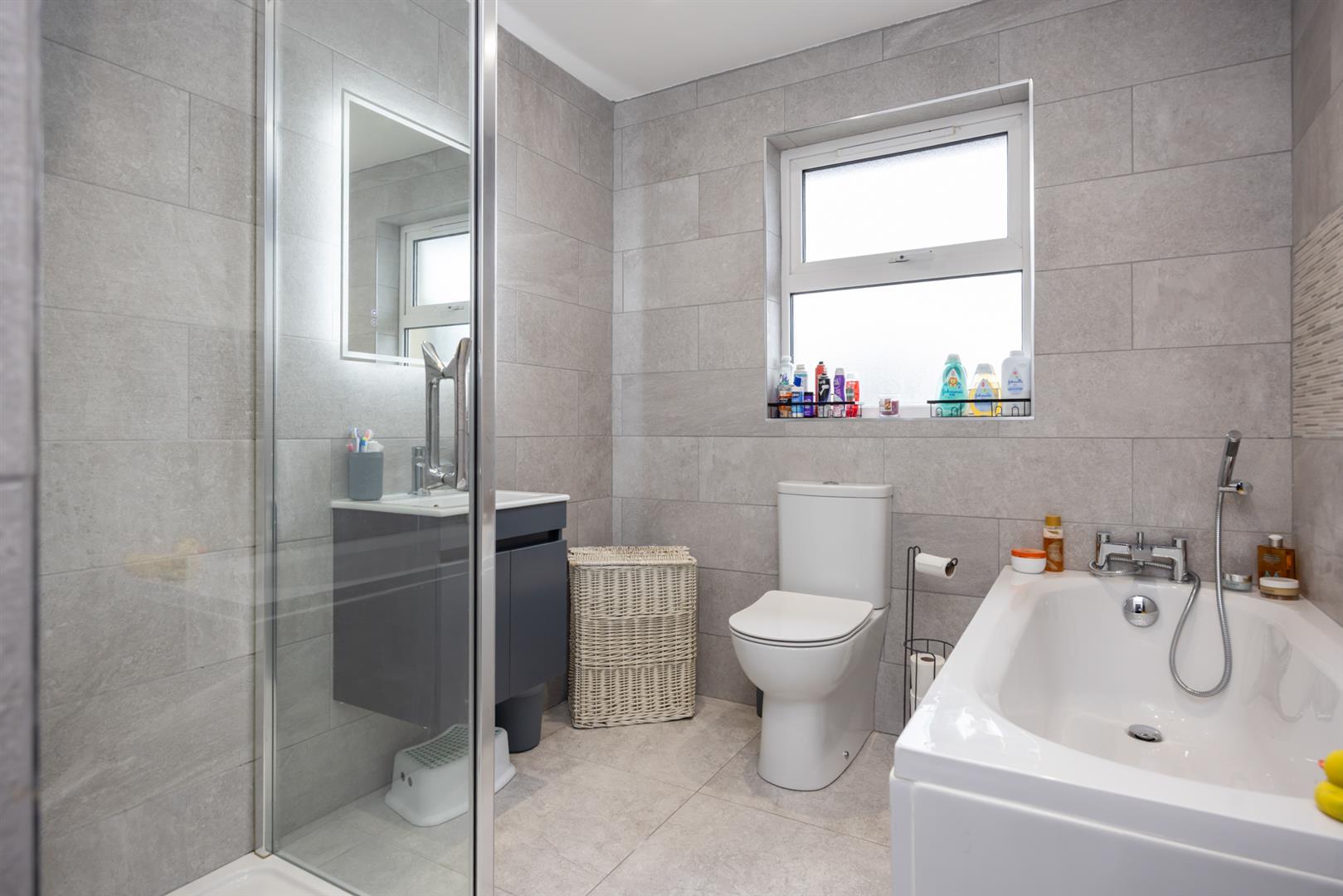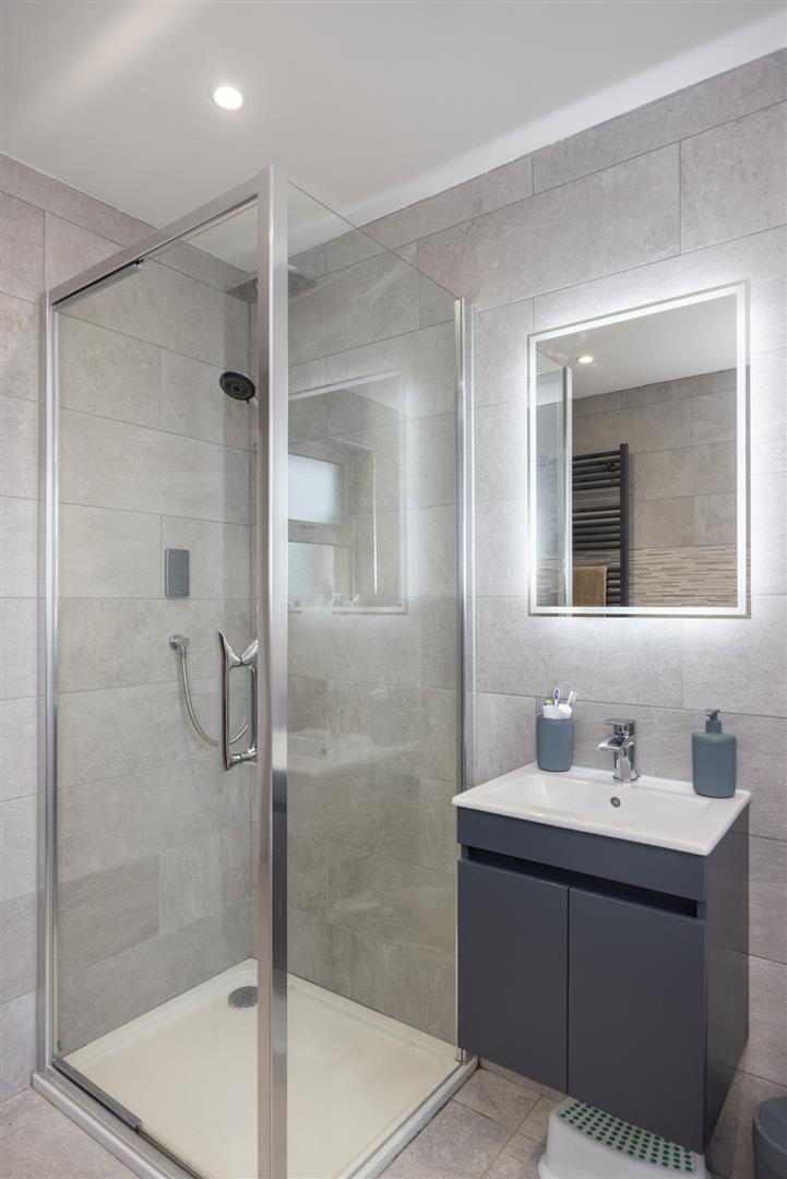Panelled bath with telephone shower over, low flush w.c, vanity unit and separate shower cubicle with wall shower. Led mirror. Fully tiled. Spotlights. Window to rear, door to: