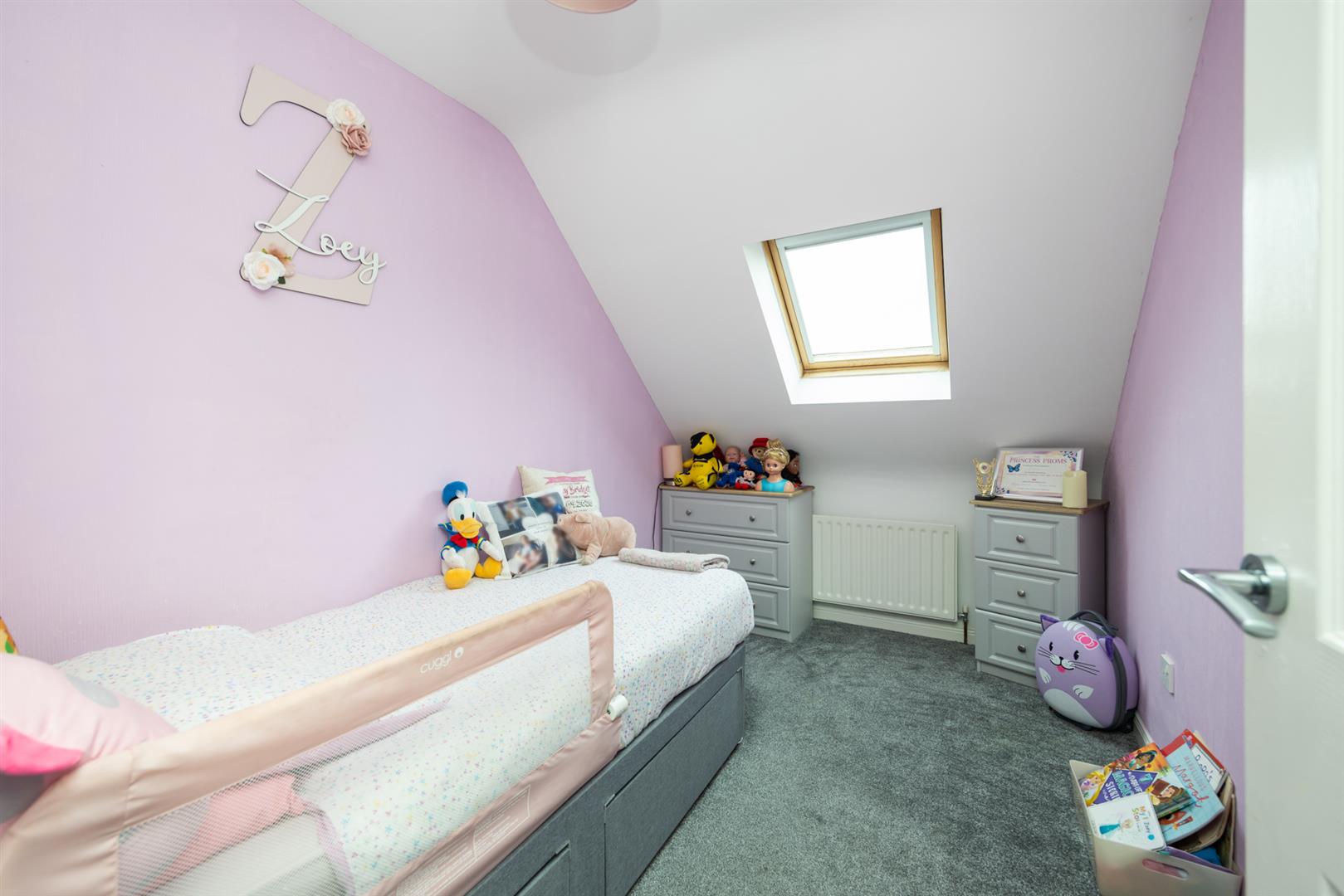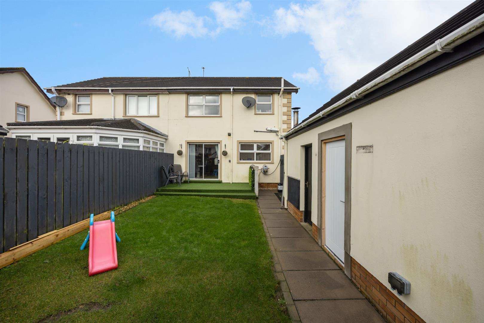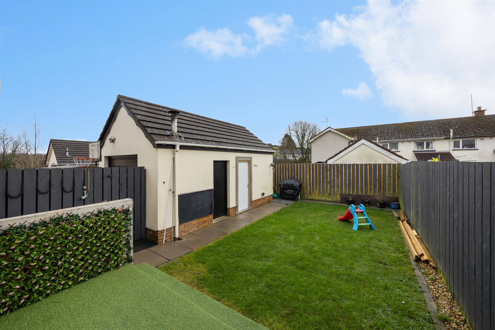 Enclosed rear garden with gardens in lawn. Access to garage and play room. Tarmac driveway to the side with gardens in lawn to the front.