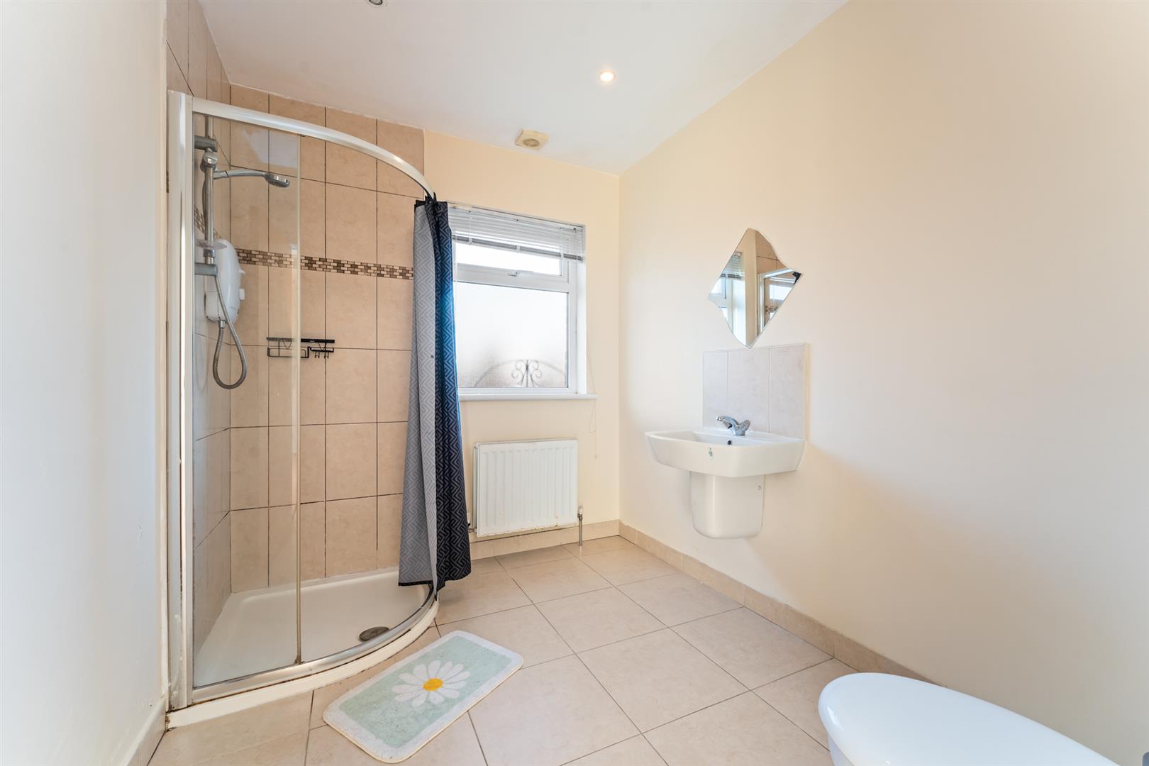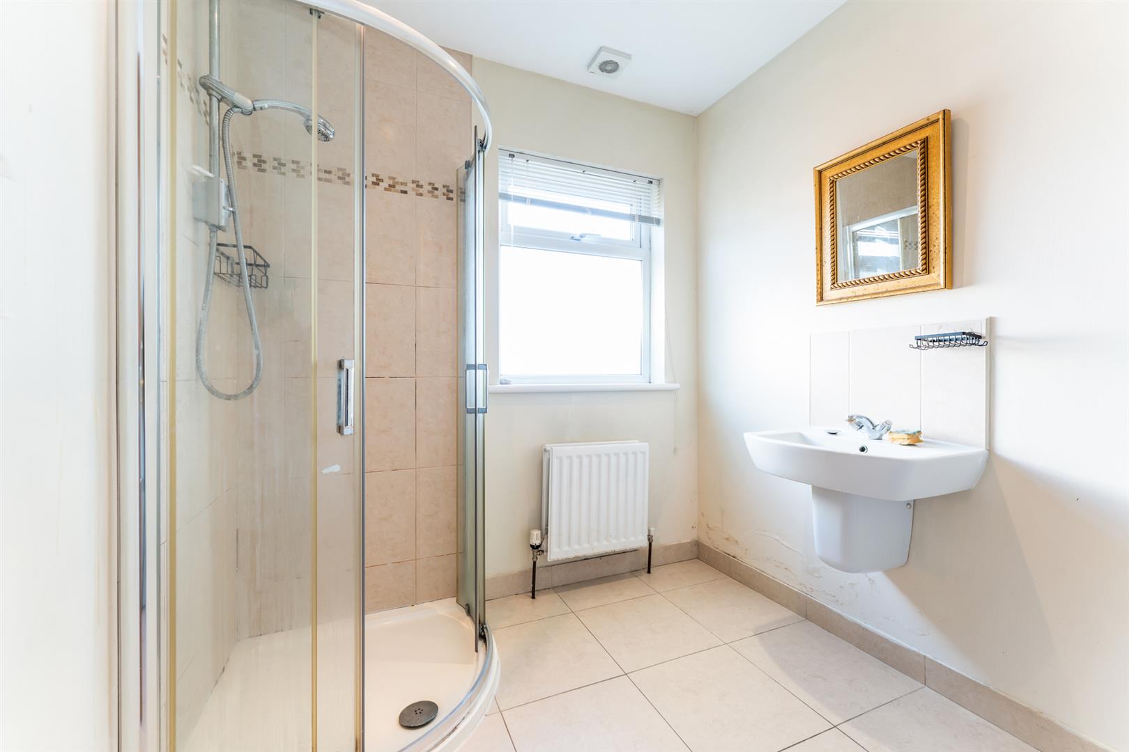 Window to side, White suite comprising shower cubicle, wash hand basin and low flush w.c.