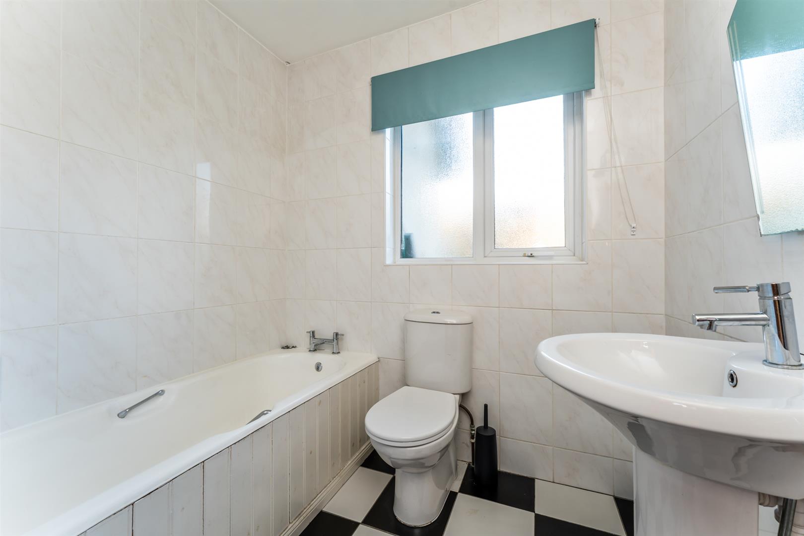 Family bathroom with comprising panelled bath, wash hand basin and low flush w.c. Fully tiled.