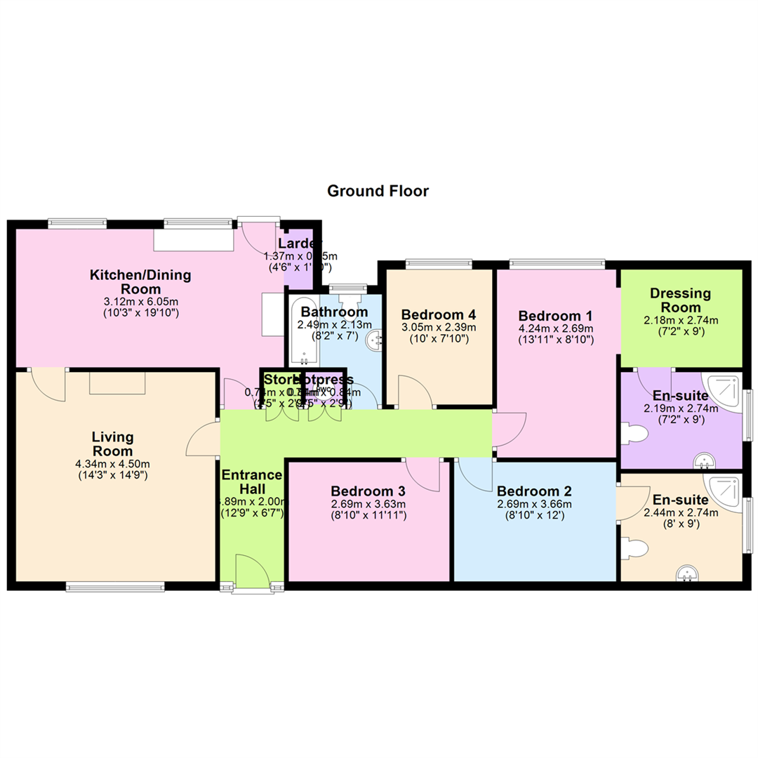 Internally, the home comprises a bright and welcoming lounge, a well-appointed kitchen with dining area and separate pantry, a family bathroom, and four generously sized bedrooms. Two of the bedrooms benefit from ensuite facilities, while the impressive master bedroom also features a dressing room and private ensuite.