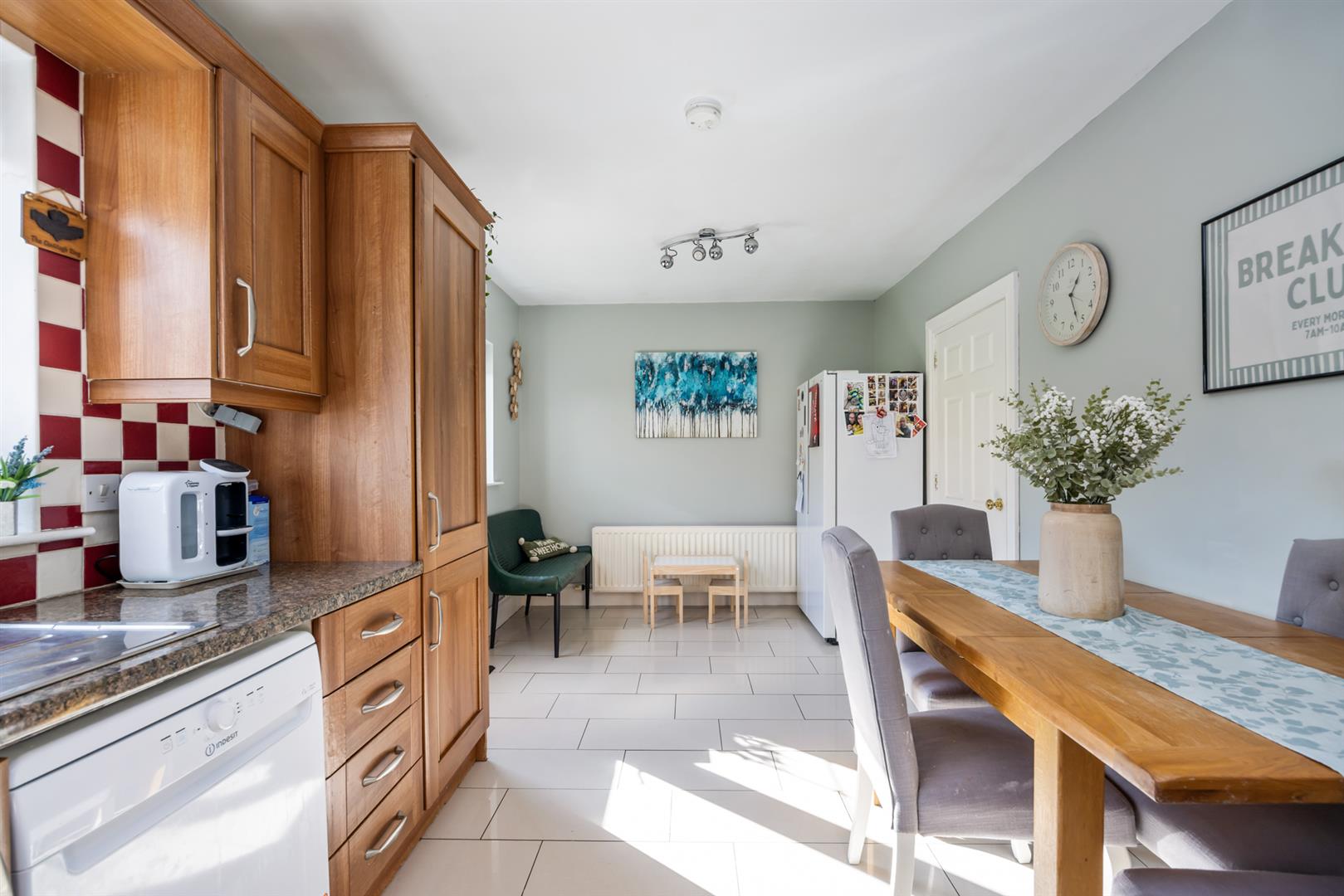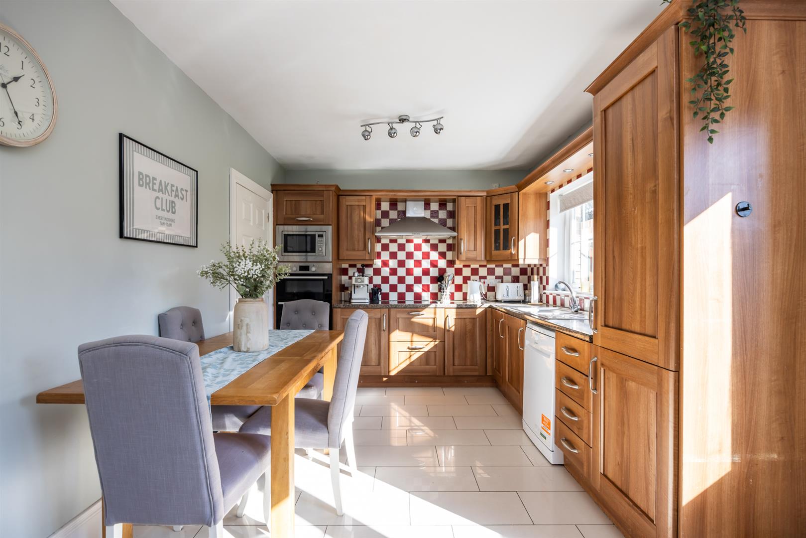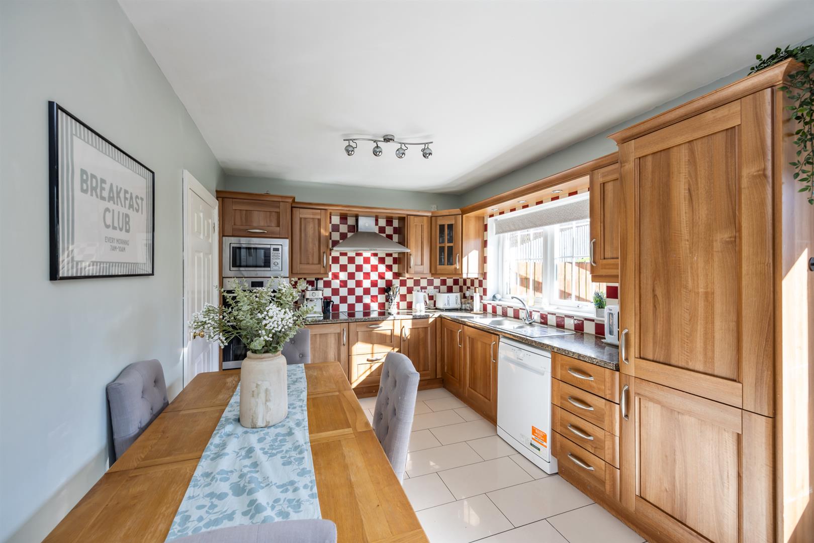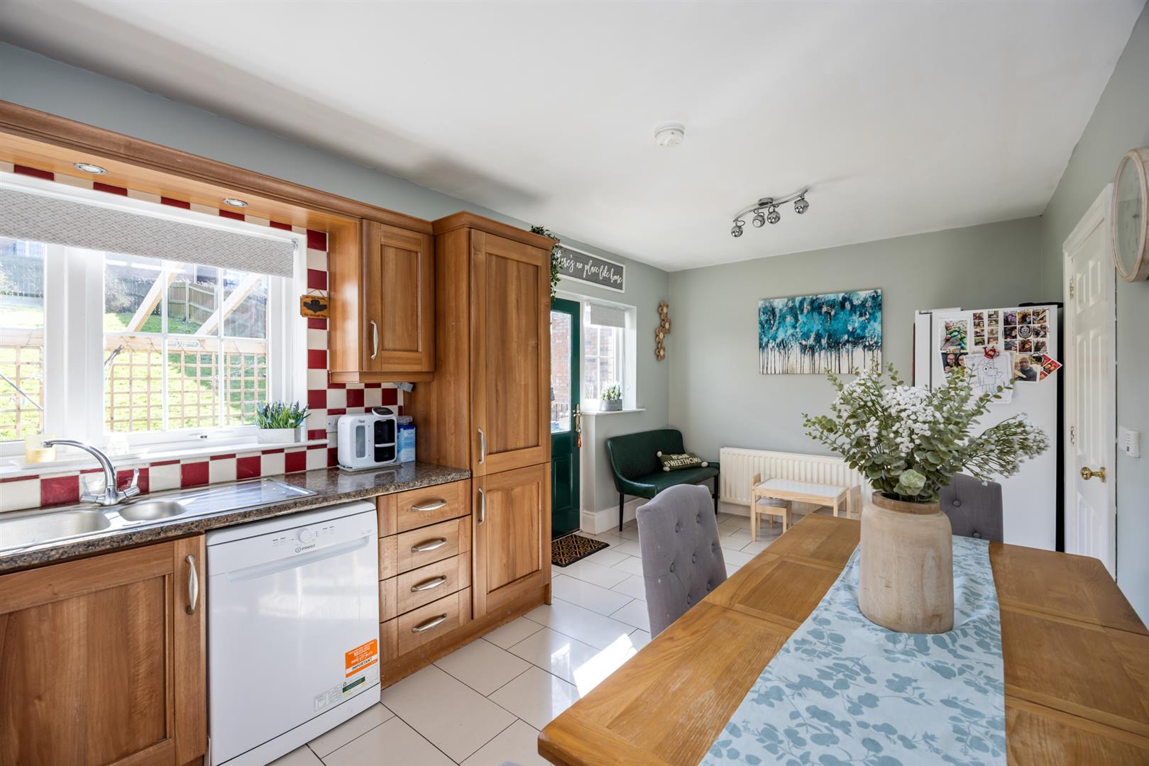 High and low level units with 1 1/2 stainless steel sink unit. Integrated double eye level oven and microwave. Integrated cooker. Recess for dishwasher. Tiled at splashback. Tiled floor. Back door to garden.