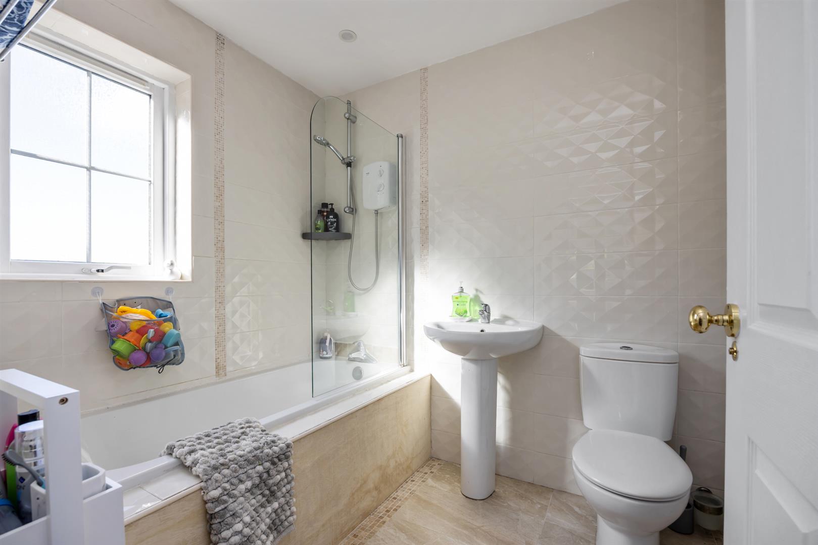 White panelled bath with shower attachment, low flush w.c., and pedestal wash hand basin. Fully tiled. Window to side, door to: