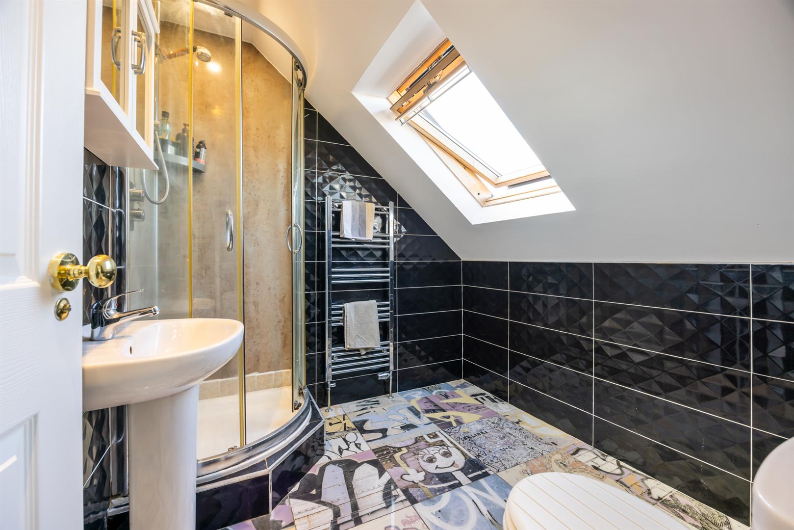 White low flush w..c, pedestal wash hand basin. Shower cubicle. Fully tiled. Towel radiator. Skylight, door to: