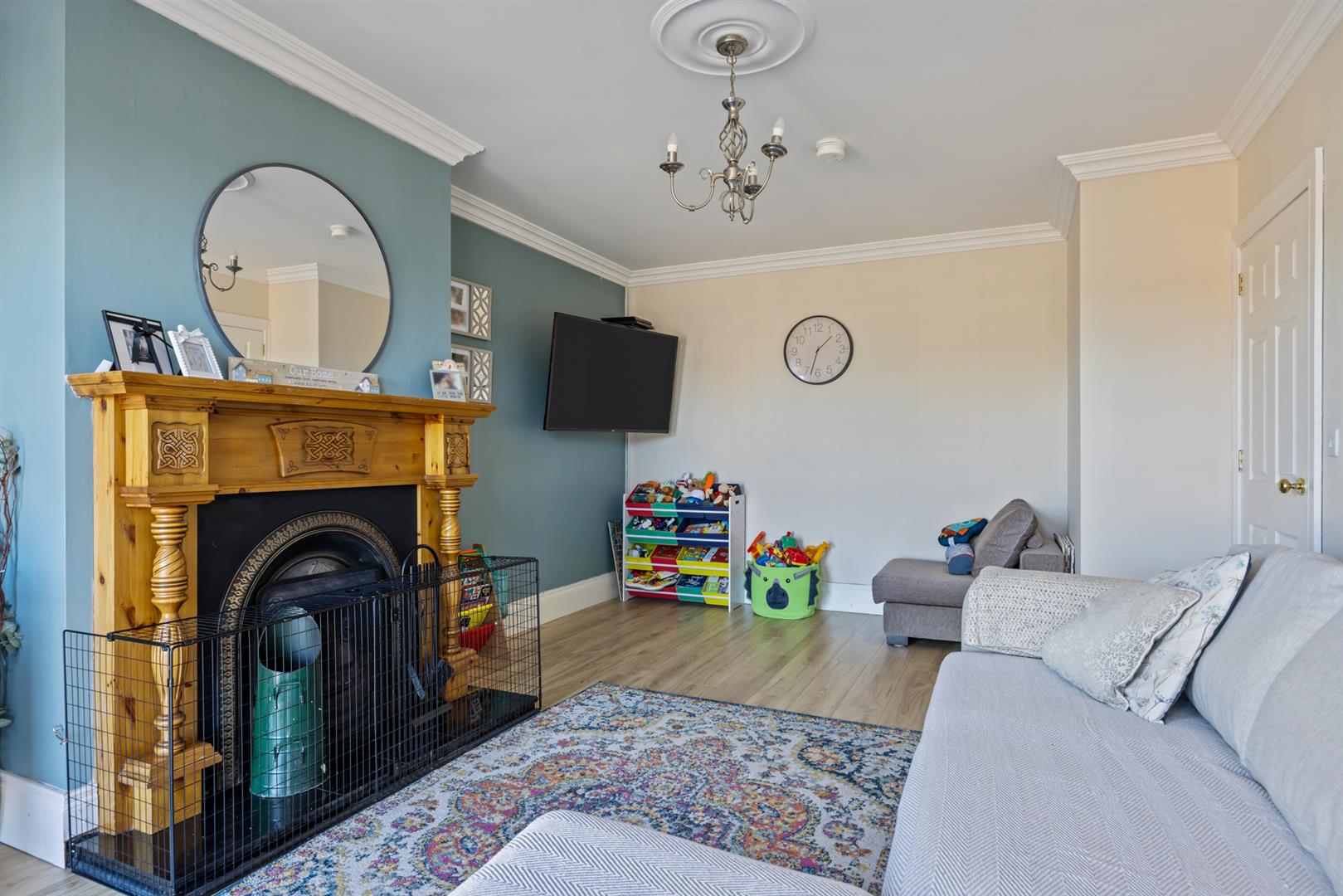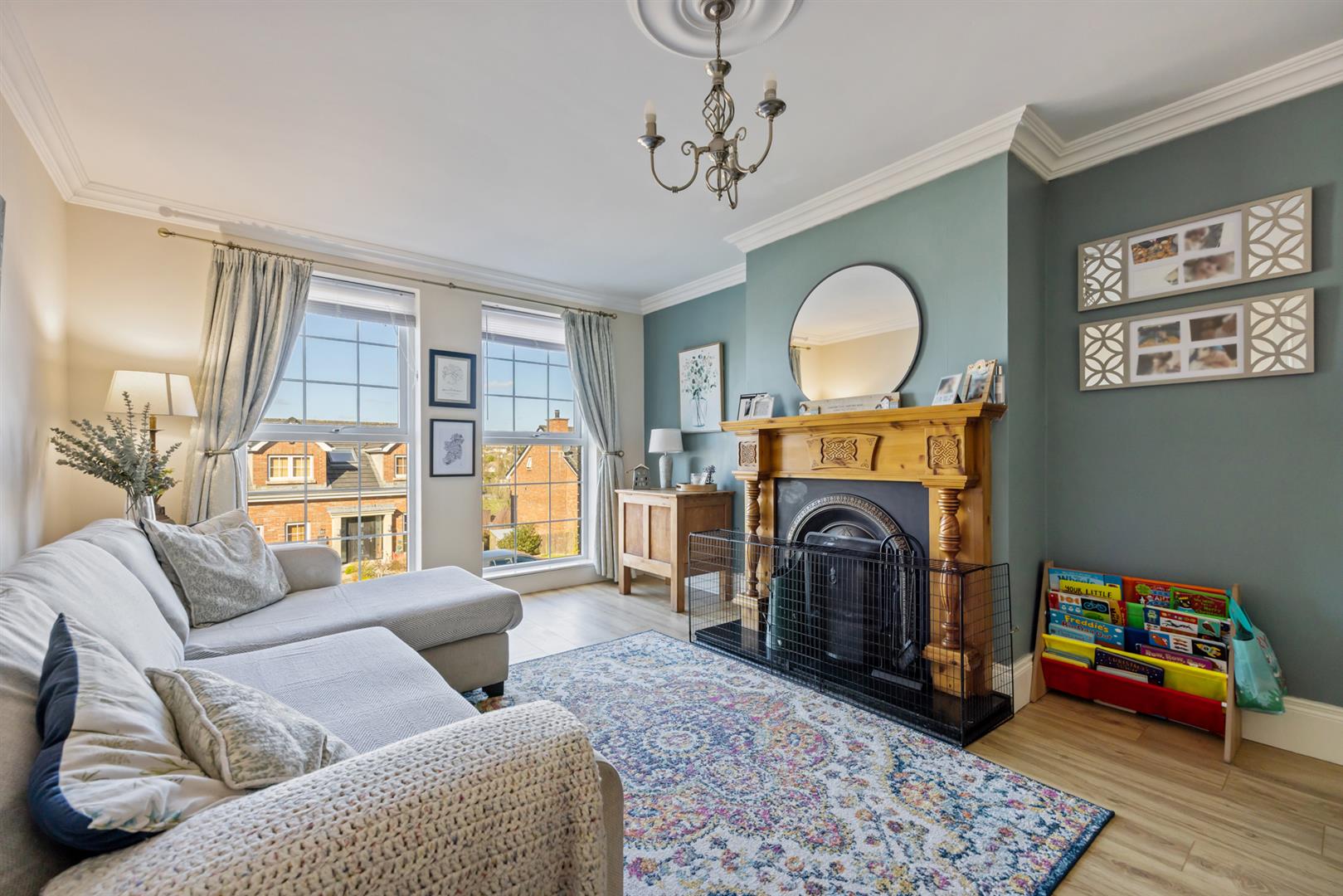Two windows to the front, Feature fireplace with wooden surround and mantle with tiled hearth. Laminated wooden floor. , door.