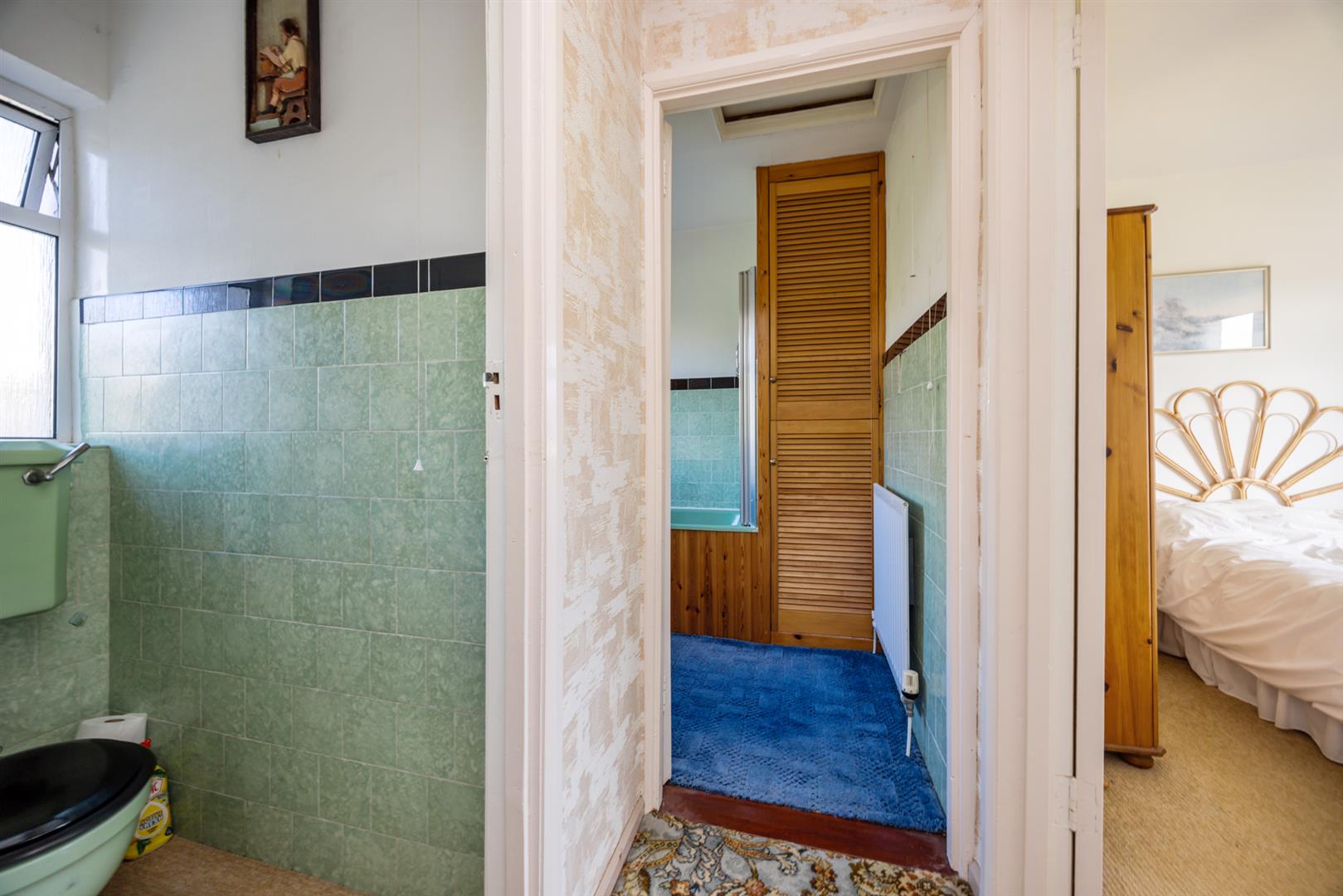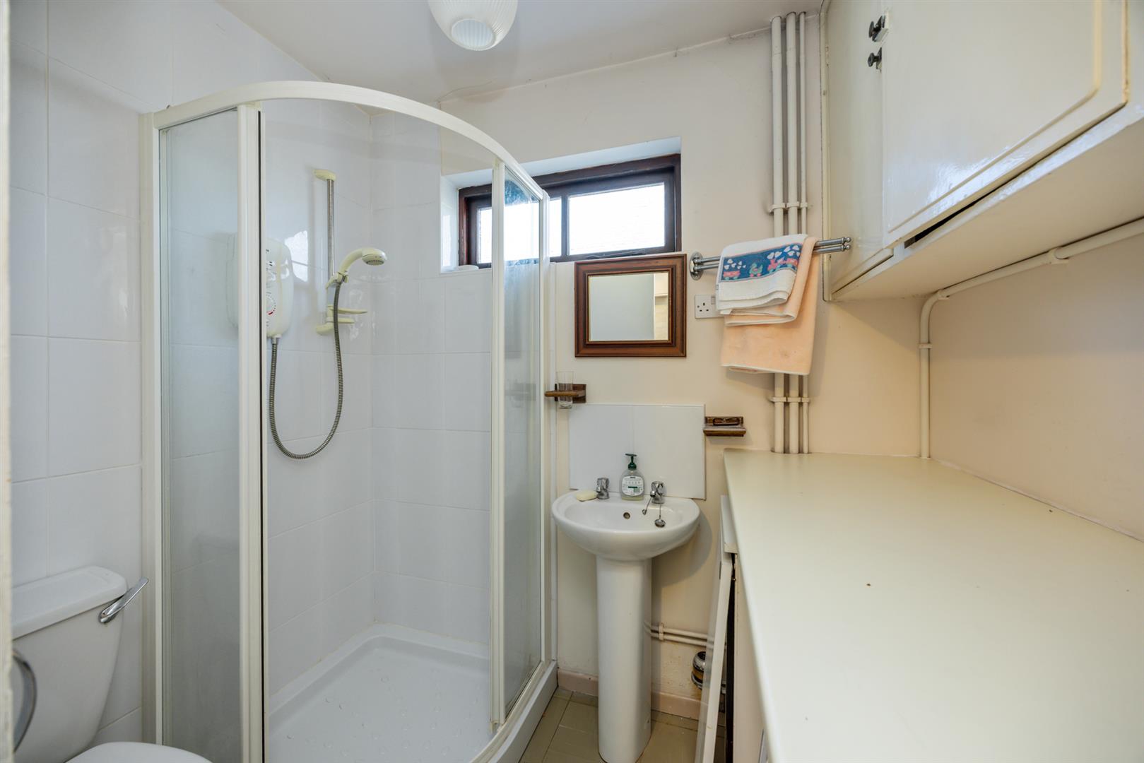 Shower cubicle with electric shower, pedestal wash hand basin and low flush w.c,, Window to side, sliding door, door to:
