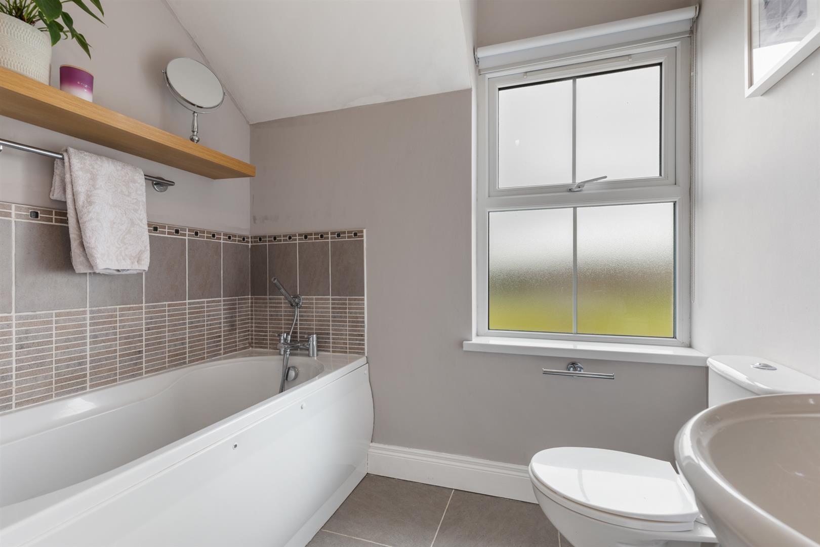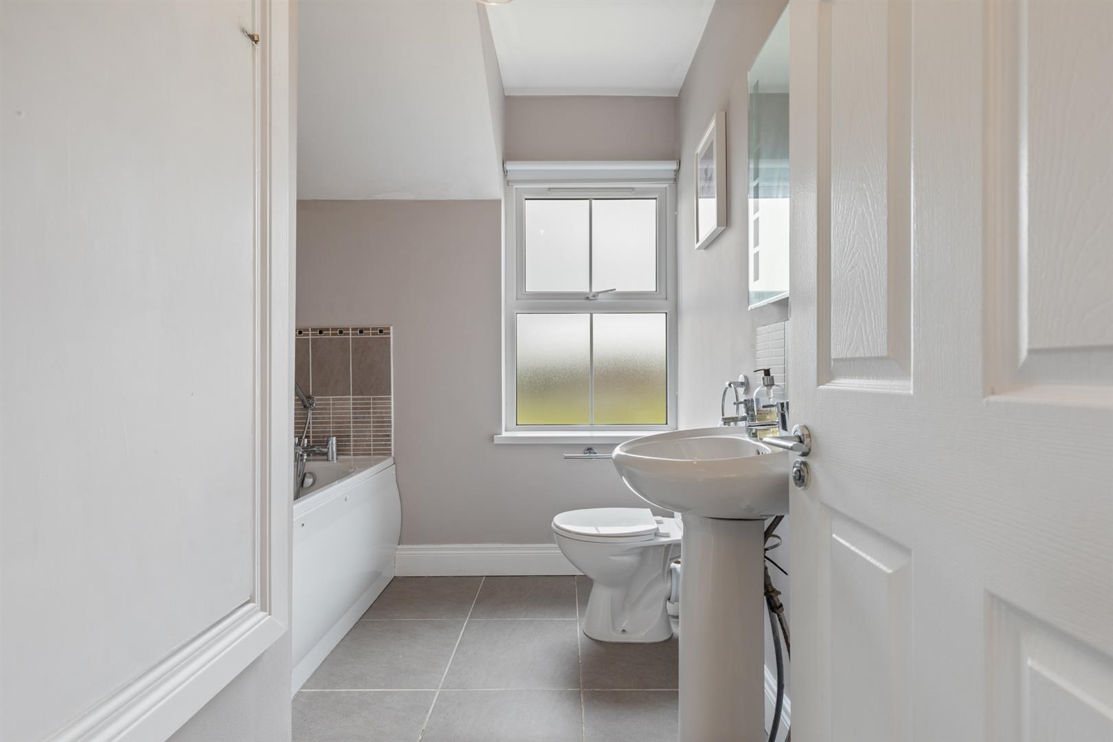 Panelled bath with hand shower, low flush w.c and wash hand basin. Tiled floor. Tiled at splashback.