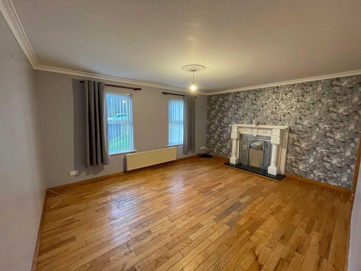 Spacious living room with feature decorative fire place. Laminate wood flooring.