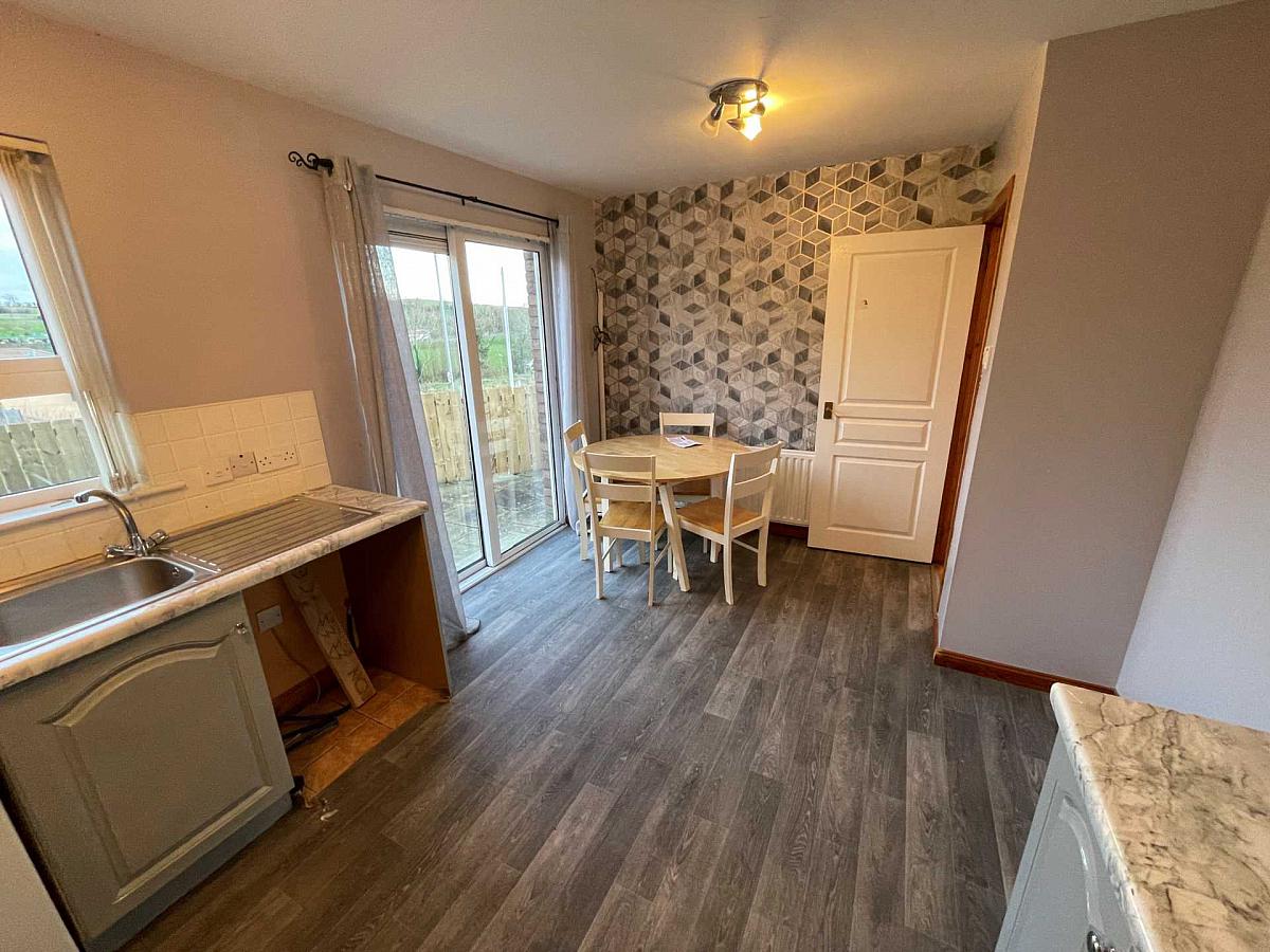 Fitted kitchen with range of high and low level units. Marble effect work surfaces. Ample dining area. Patio doors leading to rear.