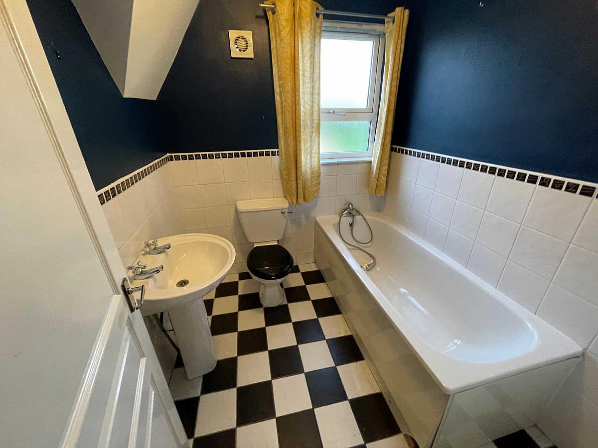 Family bathroom with white bath suite. Part tiled walls and tiled flooring.
