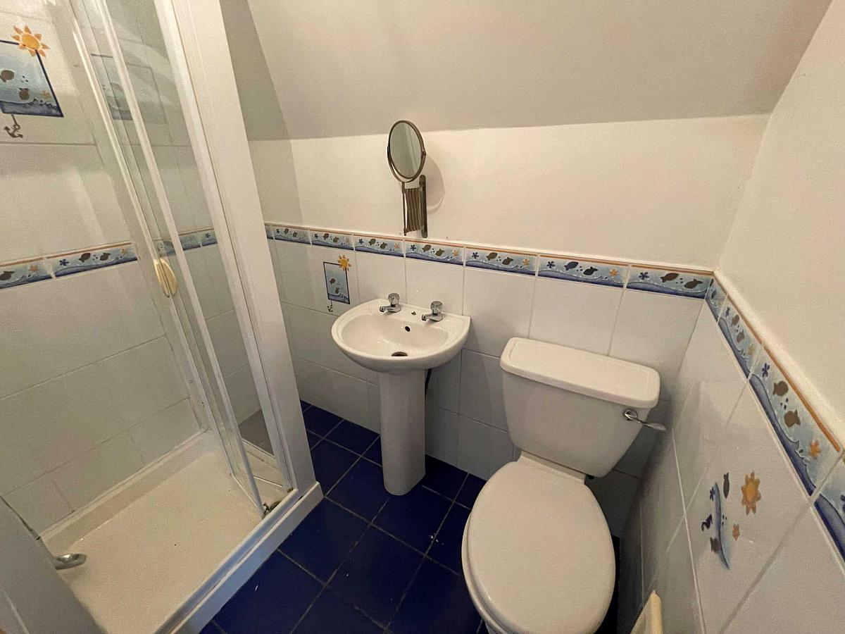 Ensuite shower room with electric shower in cubicle. Part tiled walls and tiled flooring