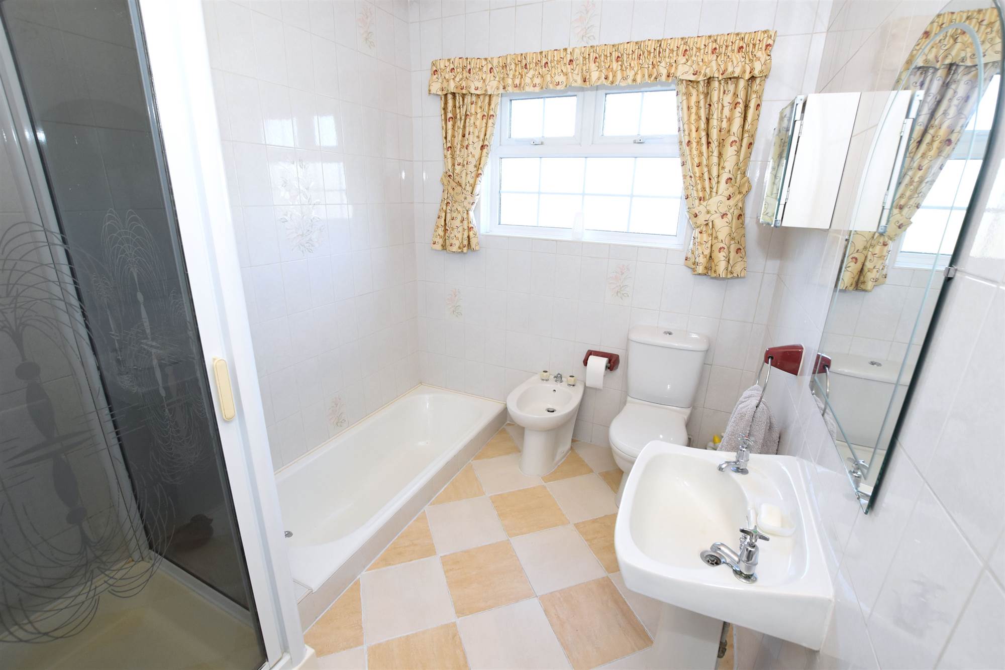 white suite to comprise of sunken bath, separate shower cubicle, pedestal wash hand basin, low level wc, fully tiled, radiator