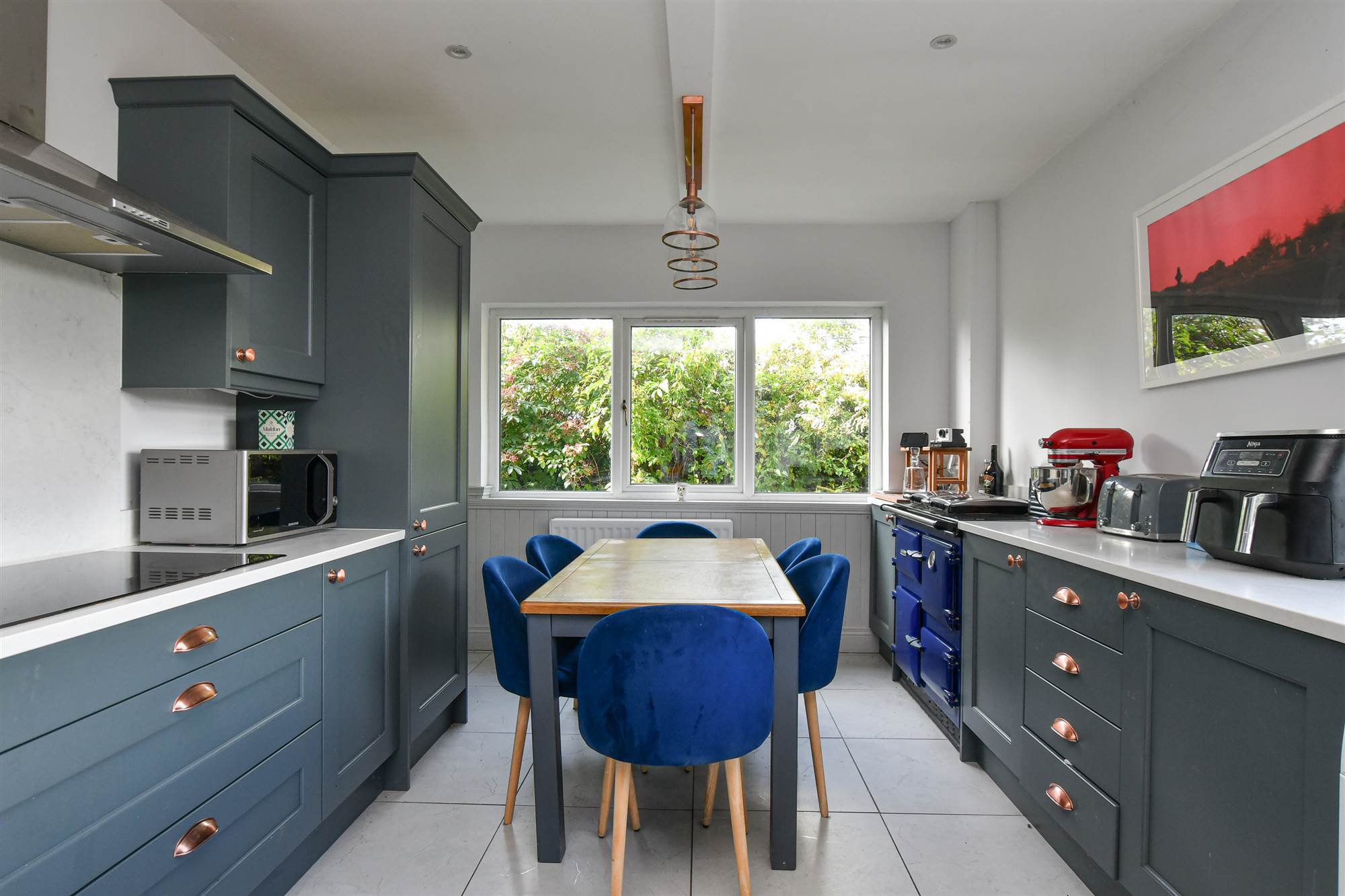 Beautifully fitted modern kitchen with appliances, dining area and garden access.