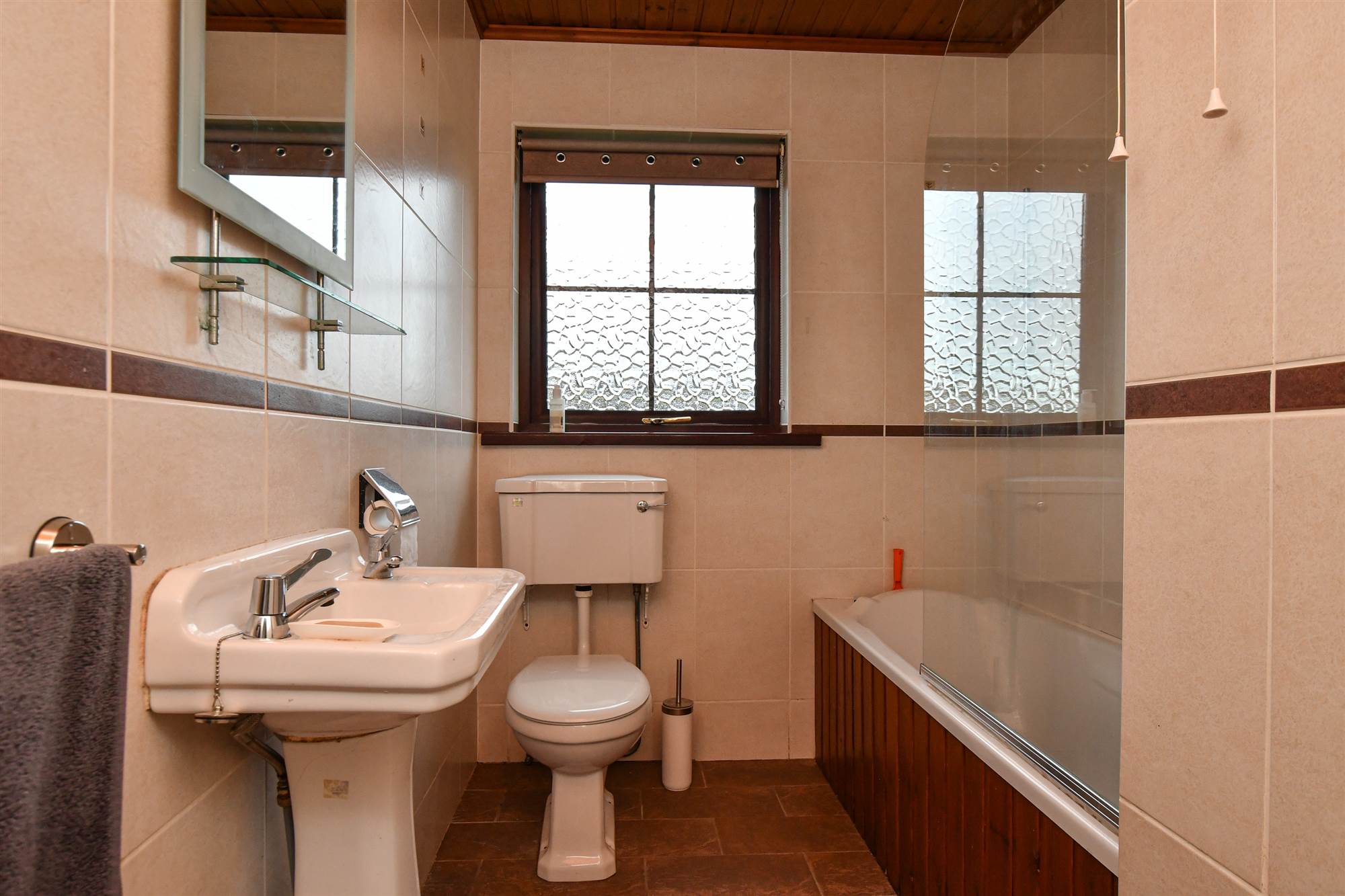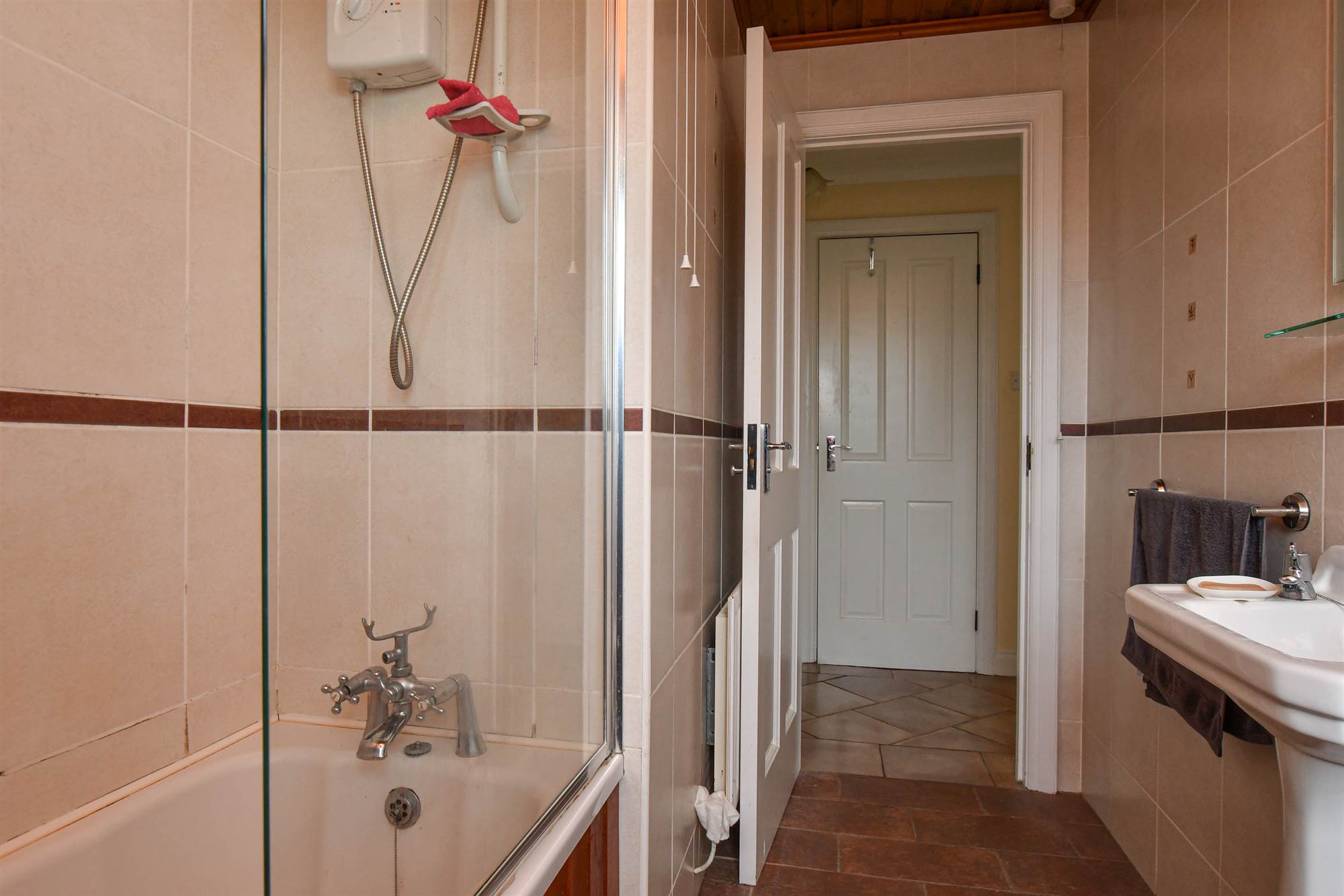 white suite to comprise of panel bath with electric shower above, pedestal wash hand basin, low level wc, fully tiled, radiator