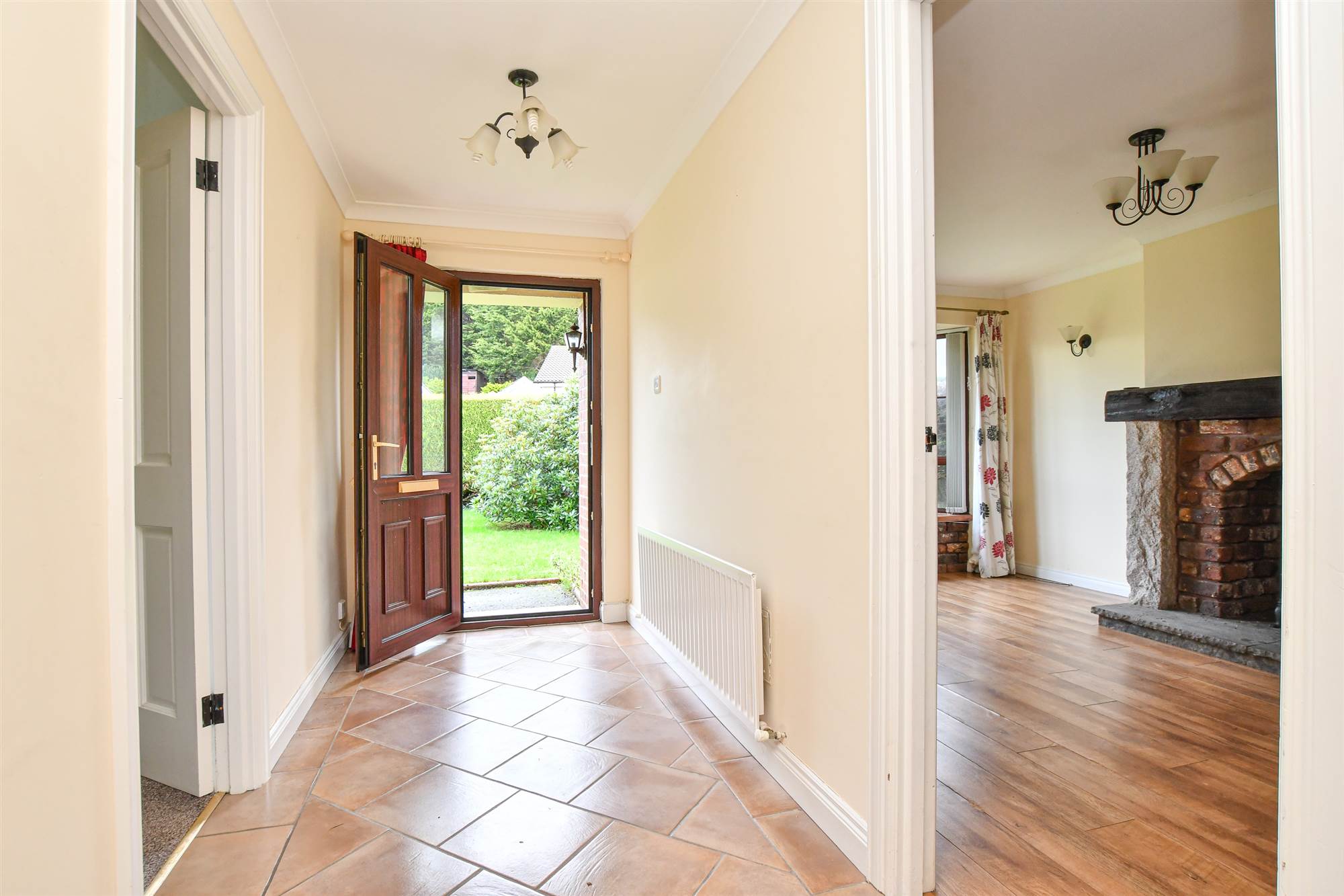 Spacious corner site with neat boundary hedgerow, lawns to front and side, tarmac parking area, paved patio with outshed