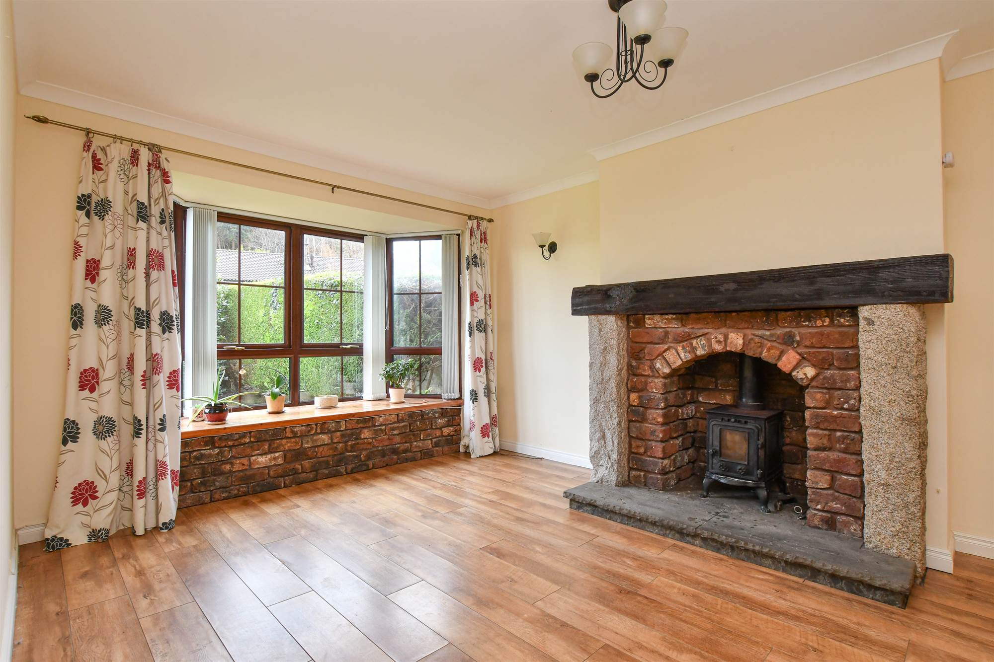 feature stone and brick fireplace with stove, bay window, laminate flooring, radiator