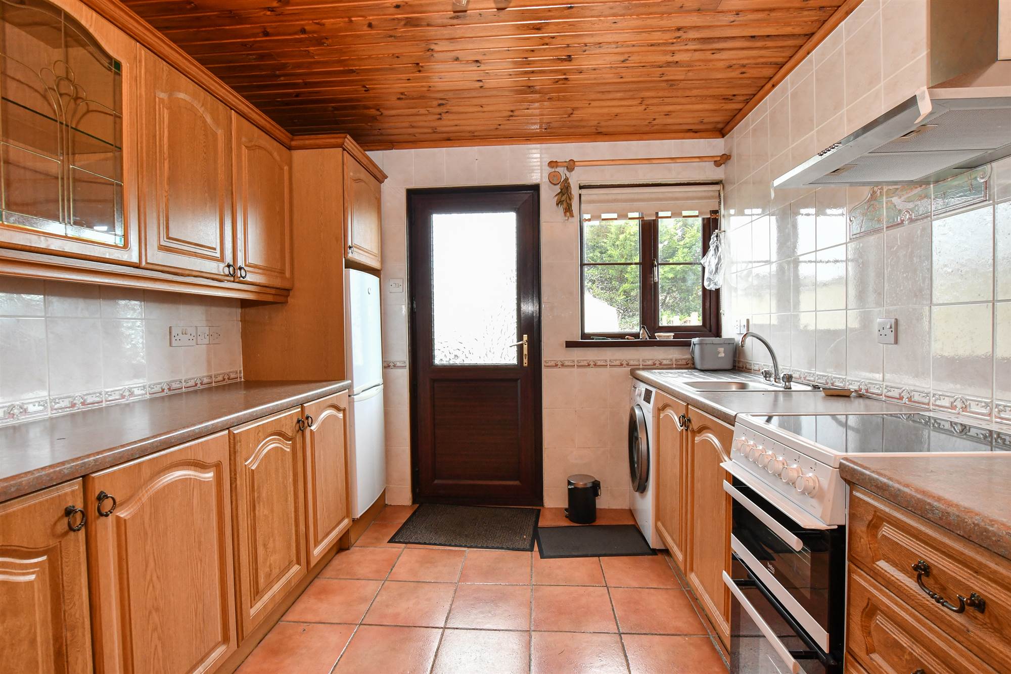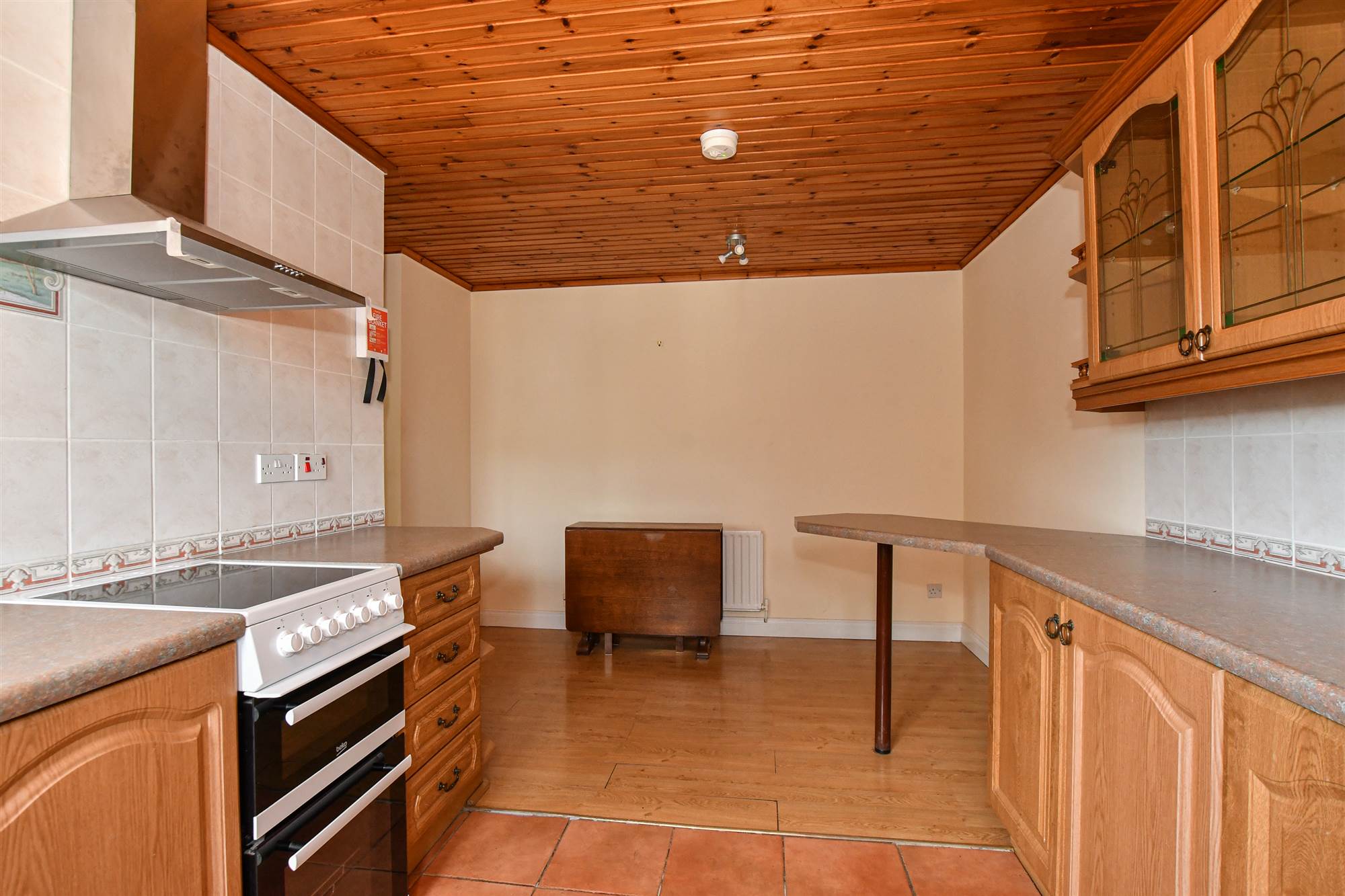 high and low level units with complimentary work-top, single drainer stainless steel sink unit, recess for cooker with extractor fan above, recess for washing machine, tongue & groove ceiling, tiled floor to kitchen and laminate flooring to dining, radiator