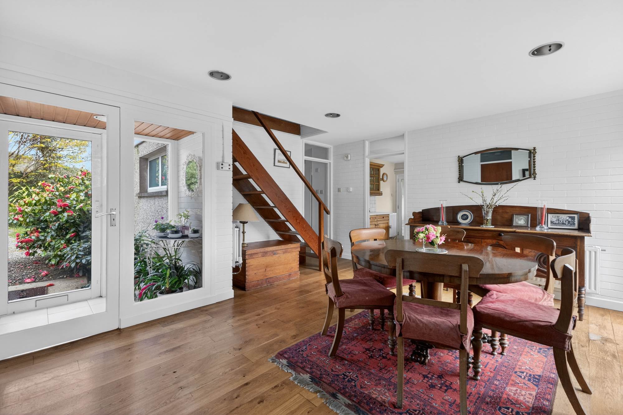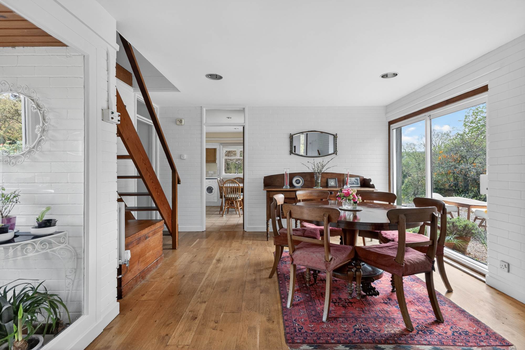 The dining room opens onto a south-facing terrace, elevated above the gardens, providing an ideal setting for outdoor dining. The home is oriented to the south to maximise natural light throughout the day, allowing each of the principal living areas to take full advantage of the picturesque views towards the river.