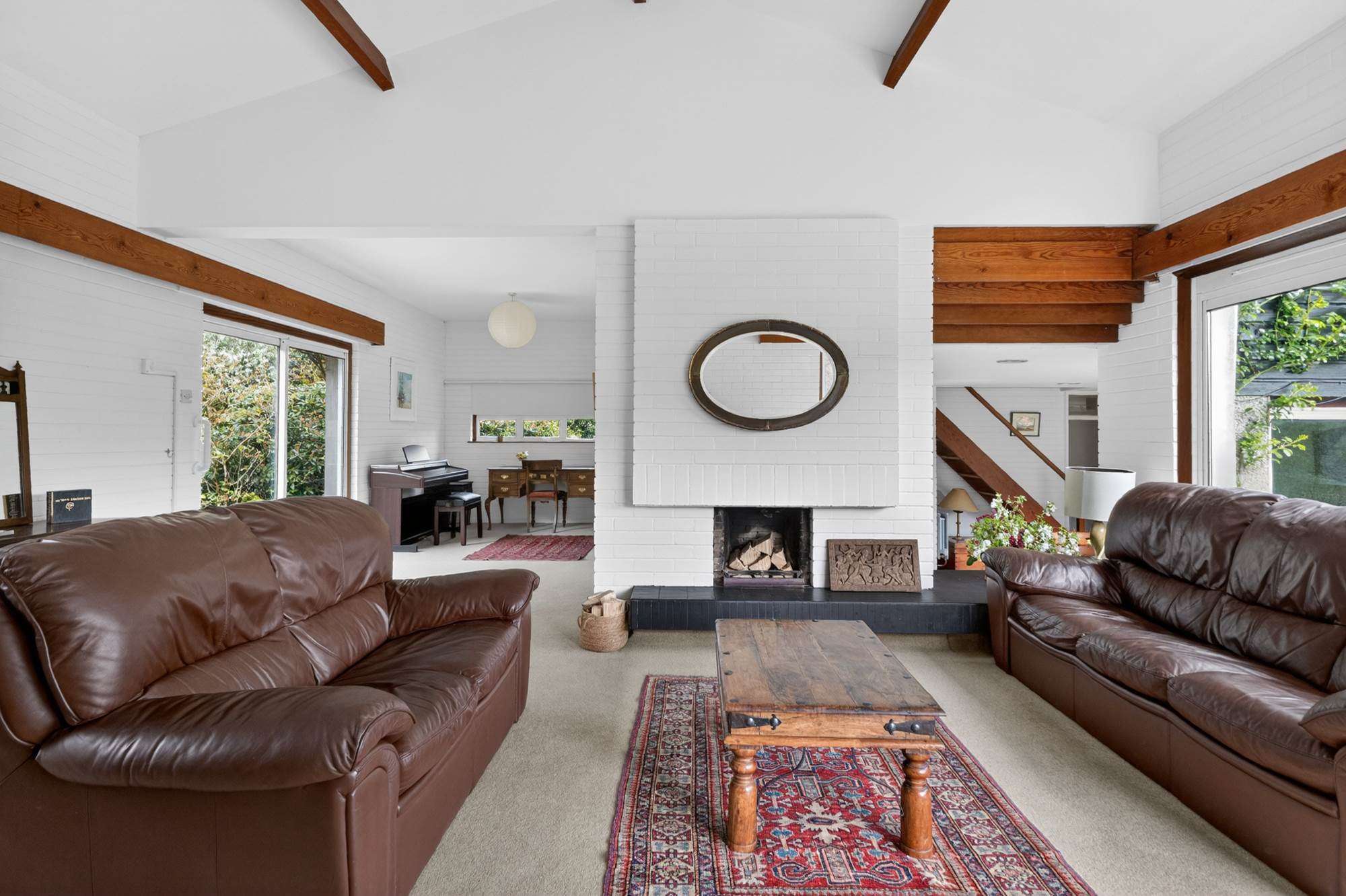 Upon entering the home, the layout immediately unfolds. From here, the living room is positioned on a half level above, while expansive views stretch out across the gardens beyond.
