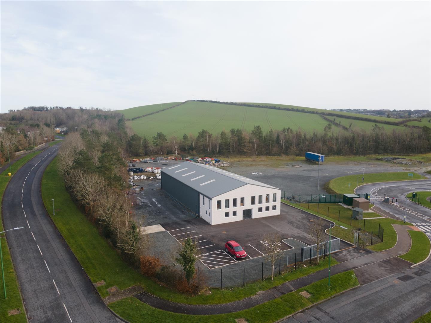 Private 1.1 acre site with 2000 sqft office space and 5000 sqft warehouse. Ground floor includes large reception area, modern kitchen, wc and separate shower room. Entrance to the warehouse which includes access to first floor offices. Warehouse is insulated and includes electric roller door. Suitable for a mezzanine floor for additional storage. Rear yard will be concreated in April.