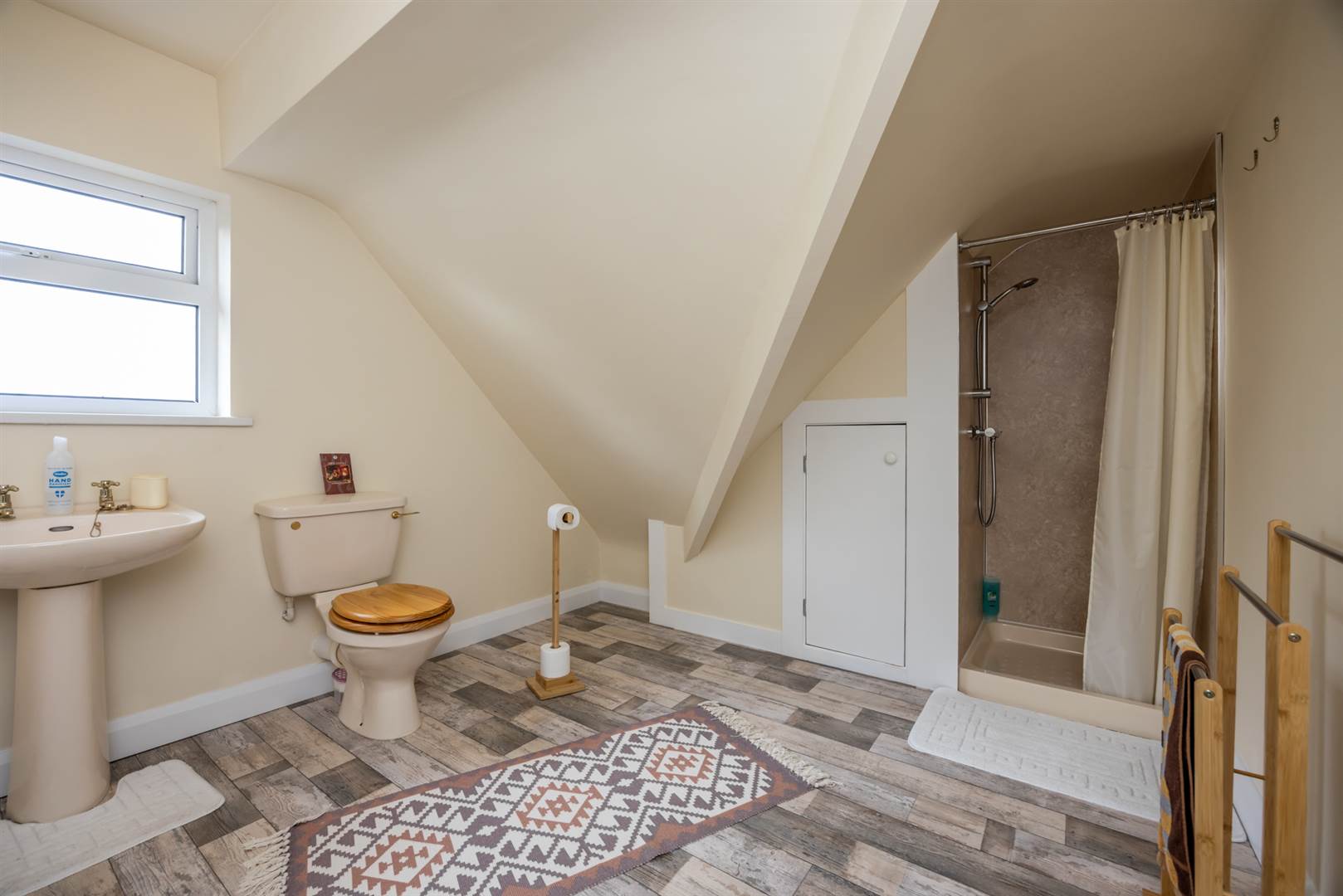 Low flush wc, pedestal wash hand basin, plank effect vinyl flooring, shower cubicle with thermostatically controlled shower cubicle with shower panelled walls, double glazed Velux window, views over open countryside. Built-in cupboard.