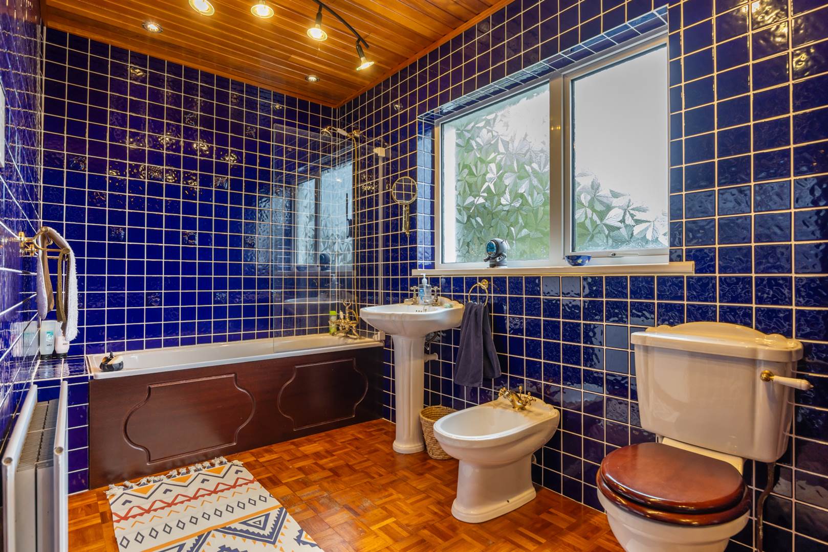 White suite comprising panelled bath, antique style mixer telephone hand shower, pedestal wash hand basin, bidet, low flush wc, fully tiled walls, parquet wood block flooring, timber panelled ceiling.
