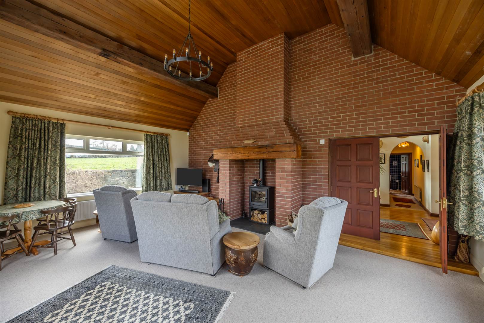 Feature vaulted ceiling with reclaimed beams, triple aspect with views over garden and open countryside. Feature brick fireplace with Dunslay inset cast iron log burning stove, slate tiled hearth.