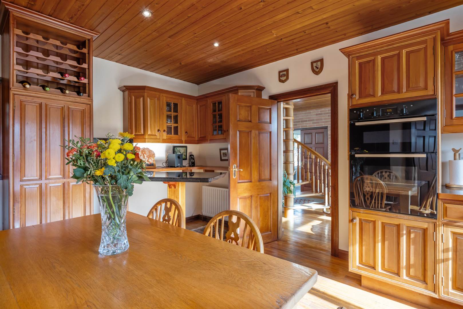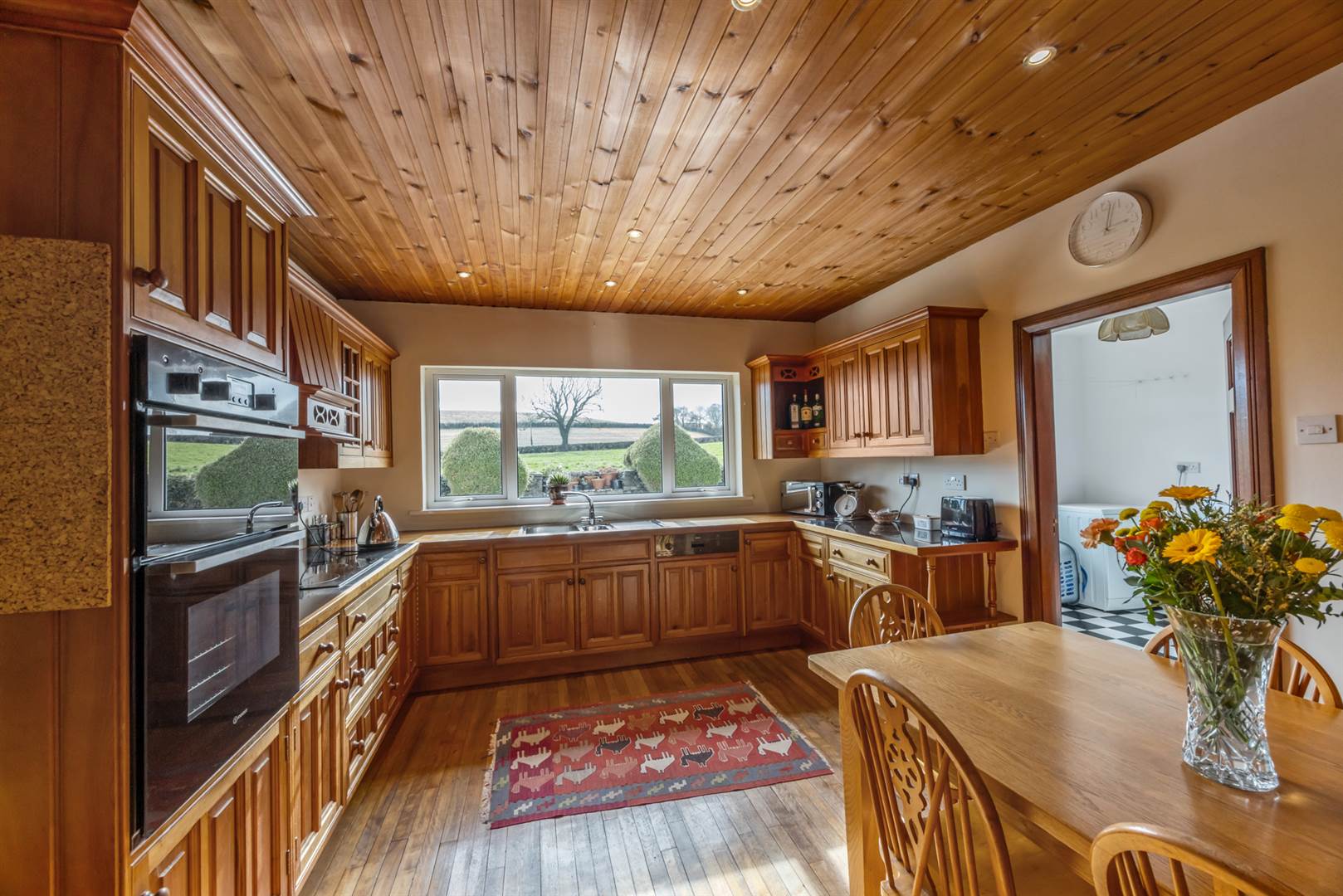 Extensive range of cherrywood high and low level cupboards, hardwood and polished granite worktops, Franke one and a half tub single drainer stainless steel sink unit with mixer tap, double oven, four ring ceramic hob, glass block splashback, cooker canopy/extractor, wine rack, integrated fridge, Bosch dishwasher, pine tongue and groove ceiling, picture rail, space for breakfast table and chairs also breakfast bar. Lovely rural views. Double doors to shelved hotpress with lagged copper cylinder, separate dry goods store.