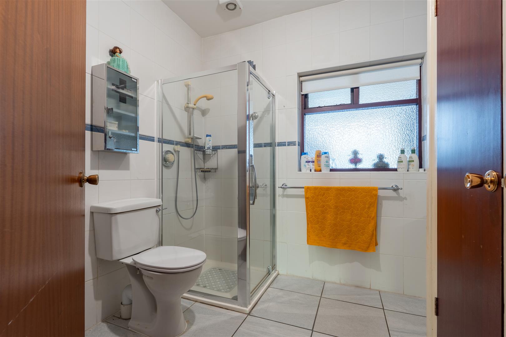 Modern white suite comprising Mira thermostatically controlled shower; glass shower door and side panel; vanity unit with fitted wash hand basin and chrome mixer taps; cupboards under; etched glass mirror; strip lights with shaver socket over; close coupled WC; hotpress with lagged copper cyclinder and Willis type immersion heater; ceramic tiled walls and floor; extractor fan.