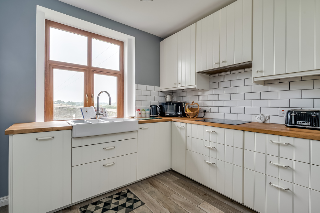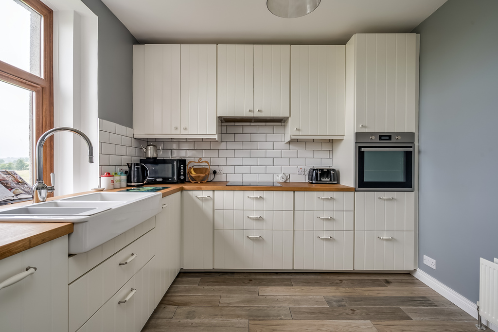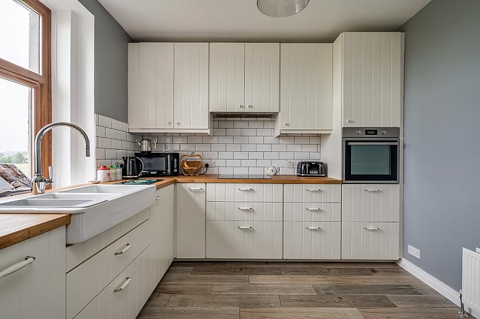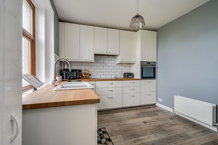 Original wooden door, A range of high and low level units with soft close doors, Wooden worktop, Belfast double sink, Flexible hose mixer tap, Integrated dishwasher, Integrated eye level electric oven, Integrated electric hob, Integrated extractor hood, Space for American style Fridge Freezer, Ceramic tiled wood-effect floor, Double panel radiator, uPVC double glazed window,