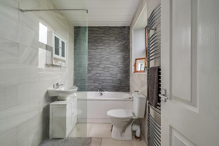 Wooden door, Ceramic tiled floor, Ceramic tiled walls, PVC clad ceiling, Bath with jacuzzi jets, Thermostatic valve Shower, Shower tray, Glazed shower screen, White twin flush WC, White pedestal wash hand basin, Chrome heated towel rail, uPVC double glazed window, Extractor fan.