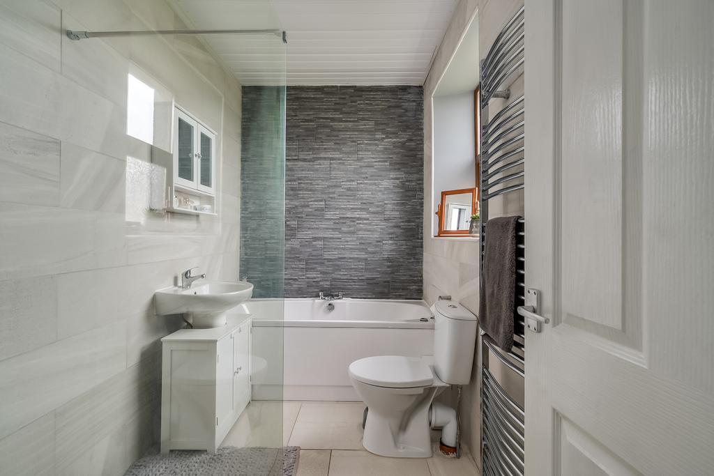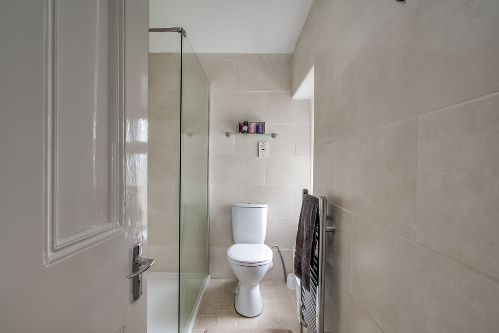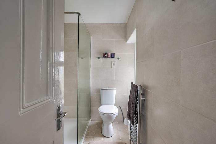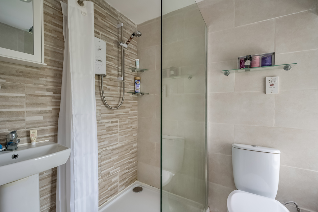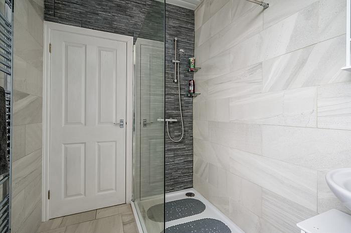 Wooden door, Ceramic tiled floor, Ceramic tiled walls, Electric Shower, Shower tray, Glazed shower screen, White twin flush WC, White pedestal wash hand basin, Chrome heated towel rail, uPVC double glazed window.