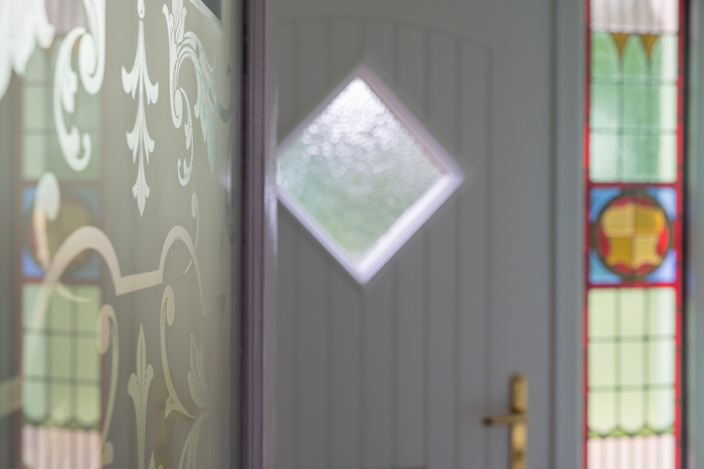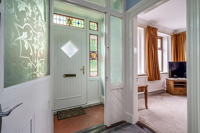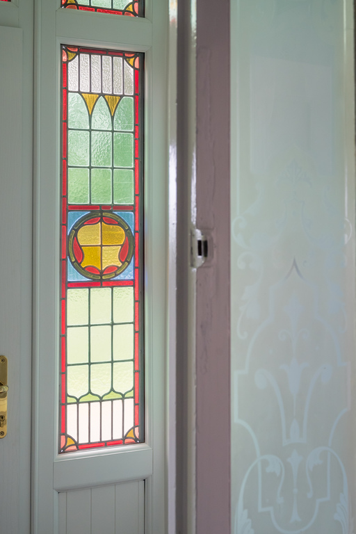 Composite front door, Terracotta tiled porch, triple glazed original stained glass window, Original glazed internal door.