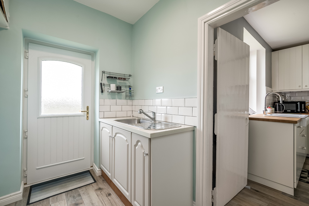 Wooden door with stain glass, Ceramic tiled wood-effect floor, Double panel radiator, Low level units, Formica worktop, Tiled splash back, Space for washing machine, Stainless steel sink with drainer, Composite double glazed door, Under stair storage, Hot water cylinder.