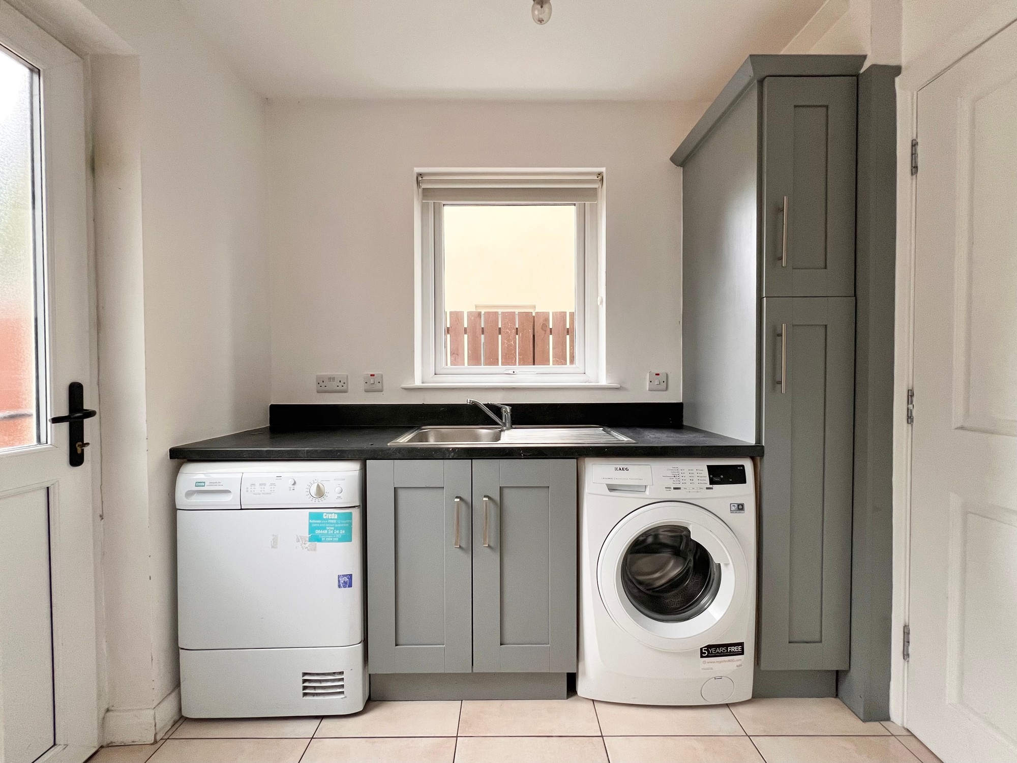 With low level units, stainless steel sink unit, plumbed for washing machine, space for tumble dryer, floor fully tiled.