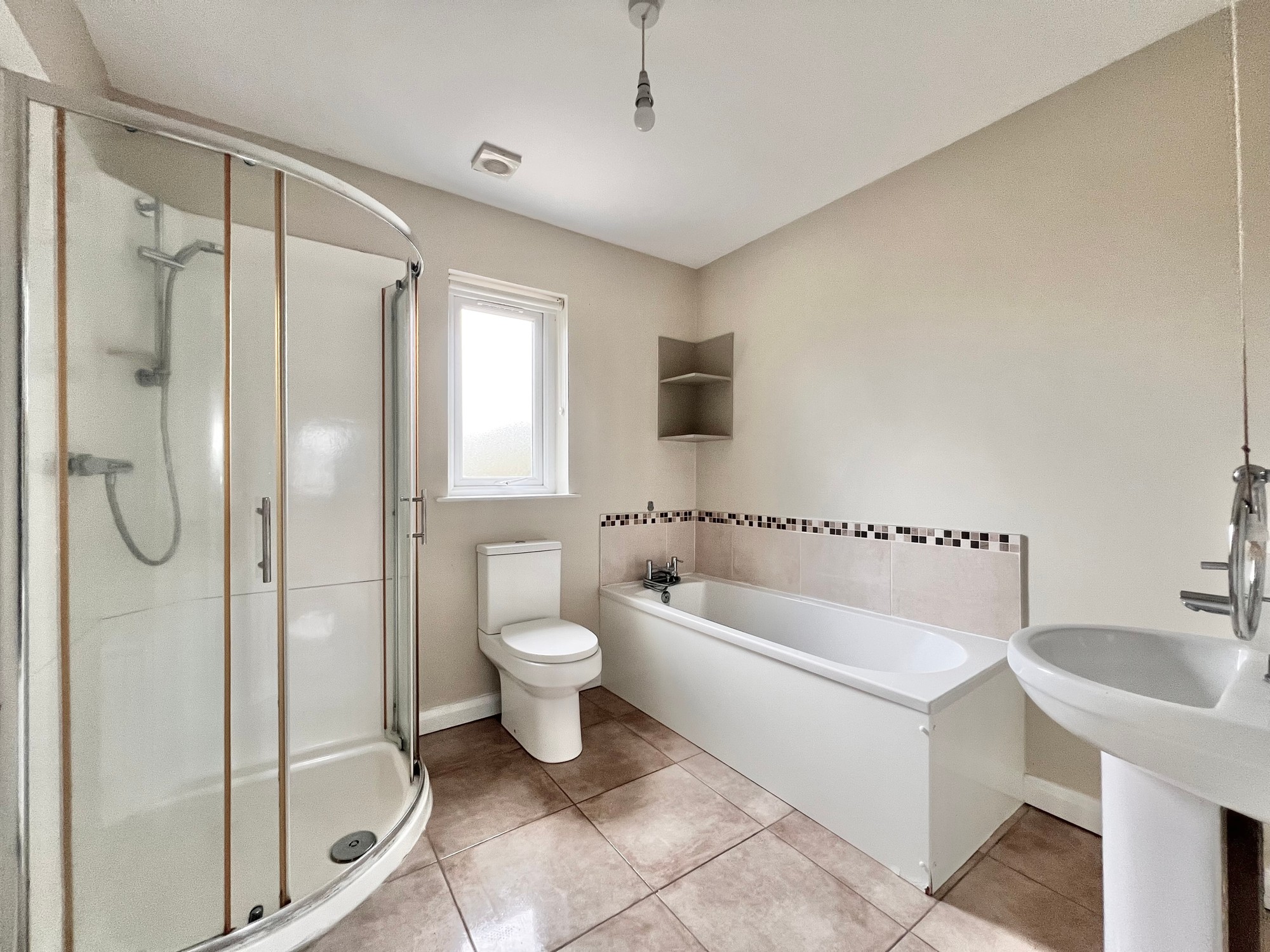 With wc, whb, bath, separate shower unit, walls & floor fully tiled.