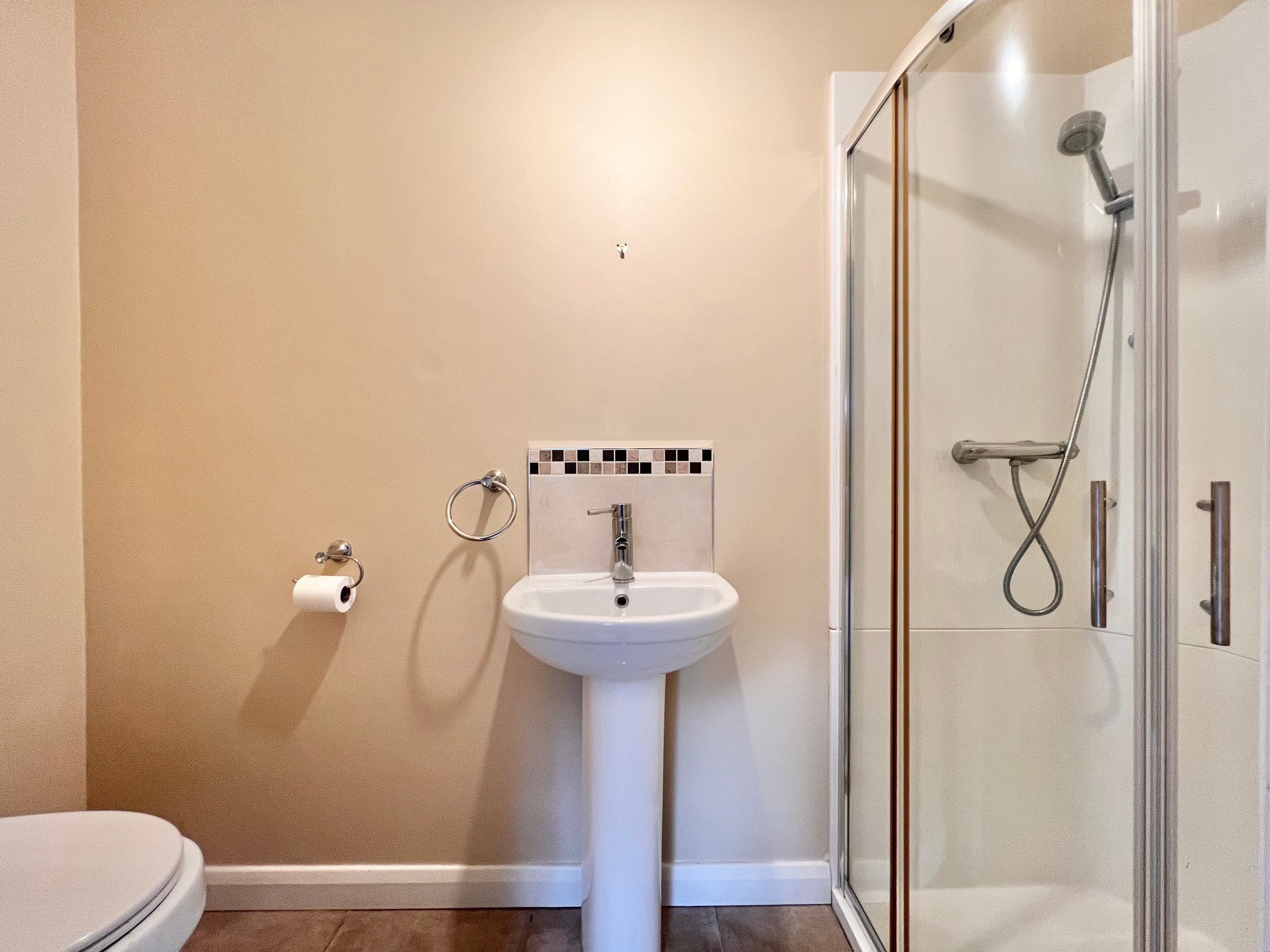 En-Suite with wc, whb, corner shower unit, walls part tiled, floor fully tiled.