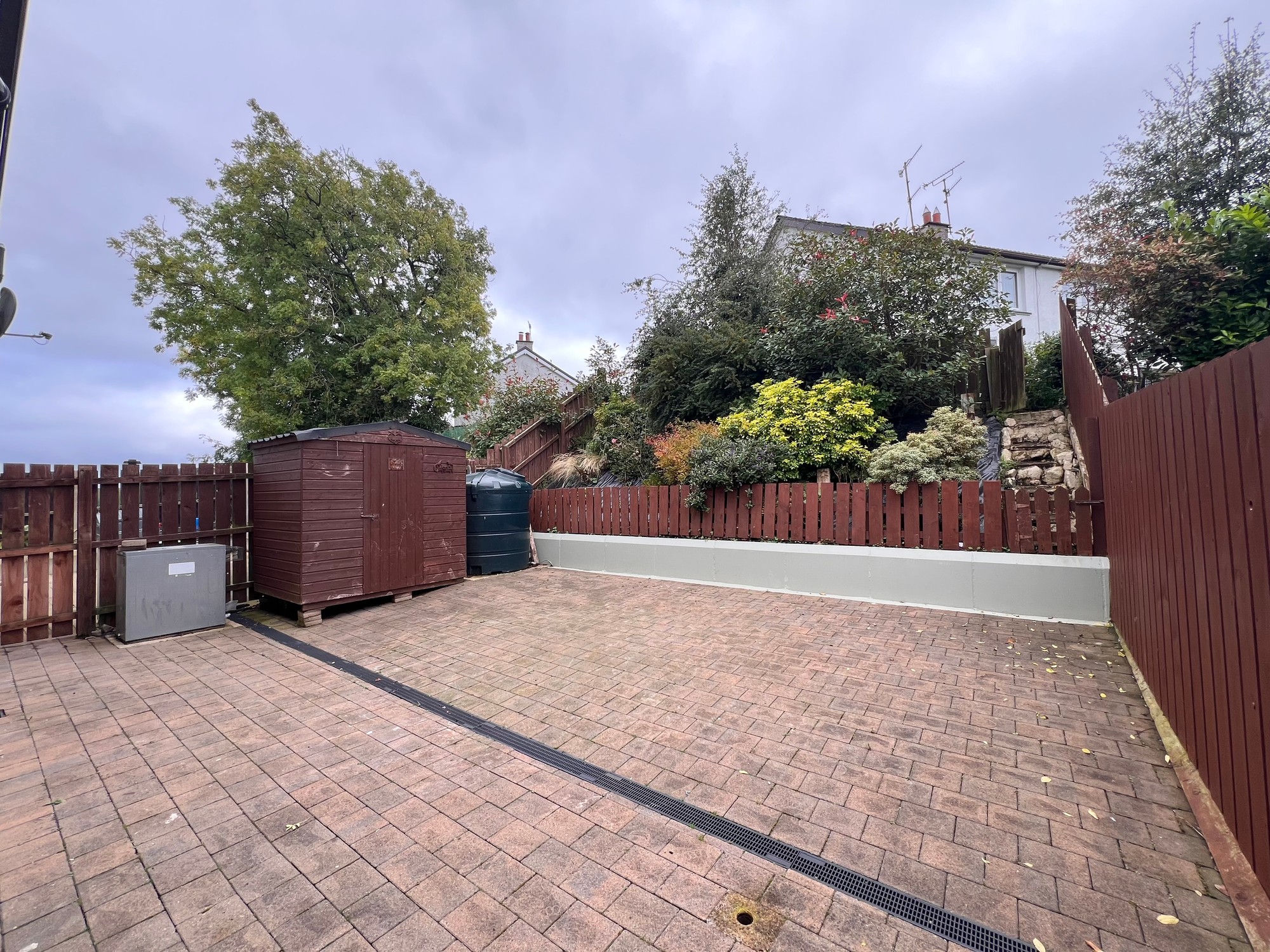 Patio paved rear of rear of property with a selection of shrubs planted.