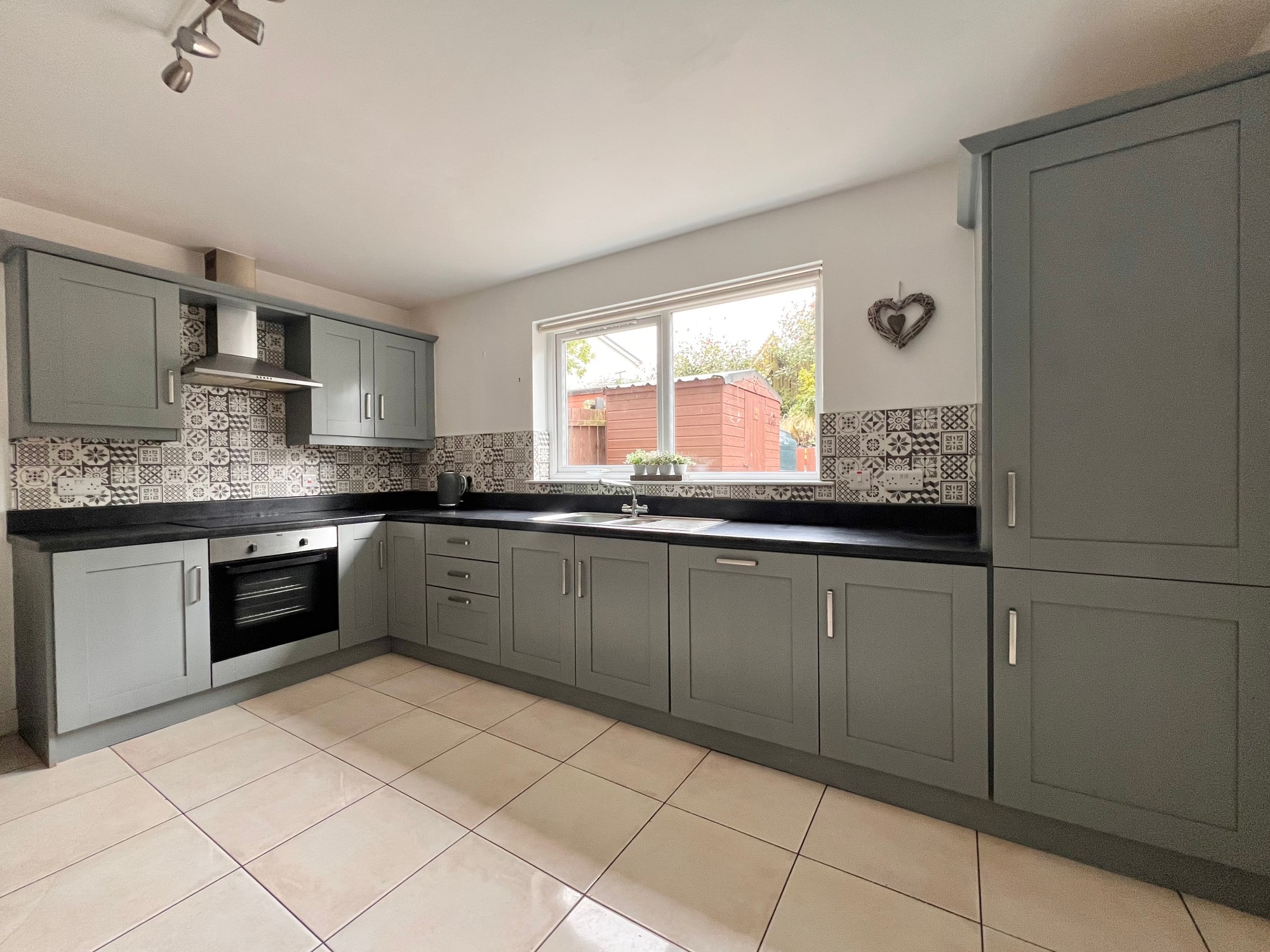 With eye and low level units, stainless steel sink and drainer unit, electric hob and oven, extractor fan, integrated fridge freezer, dining area, walls part tiled, floor fully tiled.