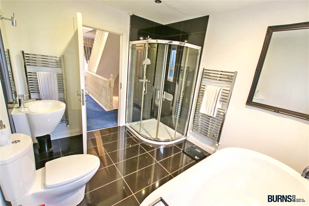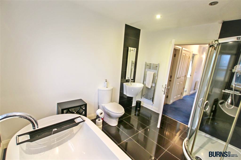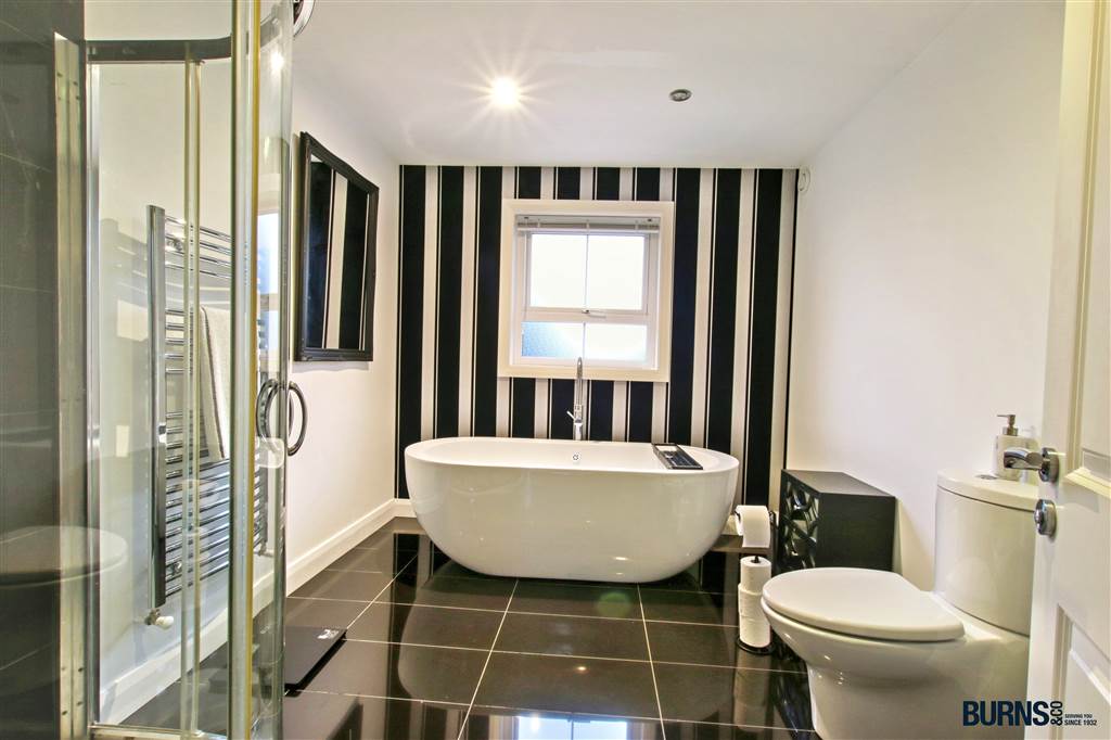 tiled floor; mains connected shower; free standing bath; heated chrome towel rails; toilet; wash hand basin with tiled splash back and wall-mounted mirror with lighting; recessed spotlighting; extractor fan.
