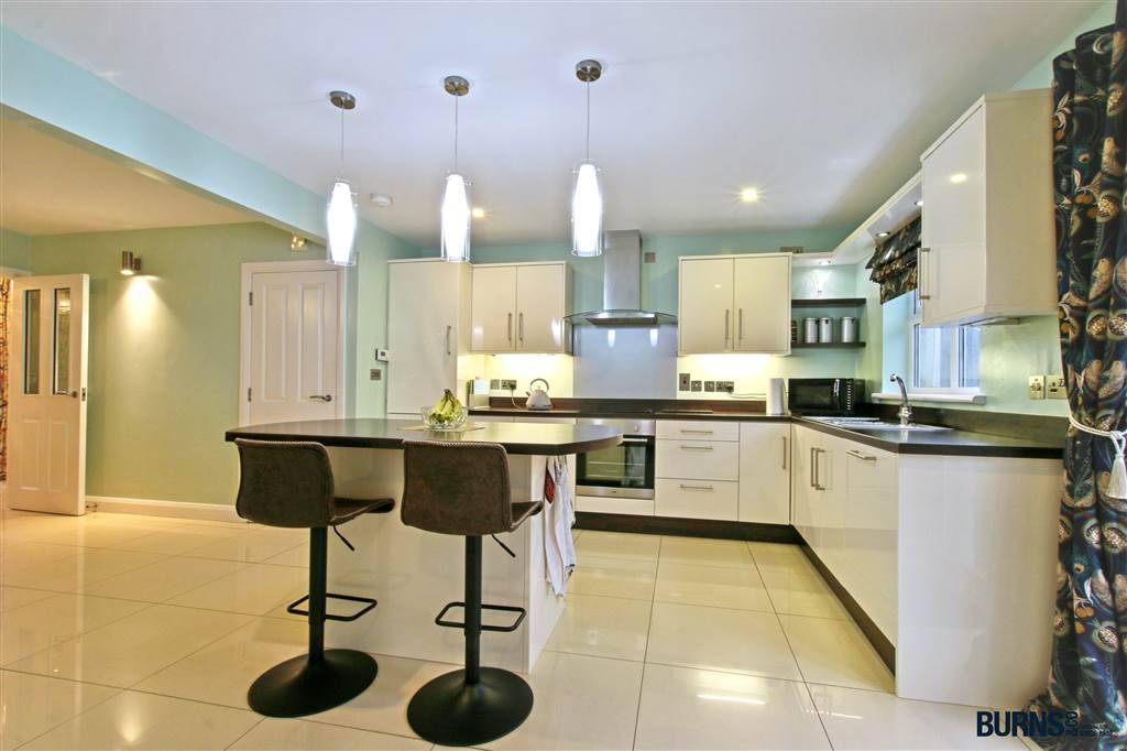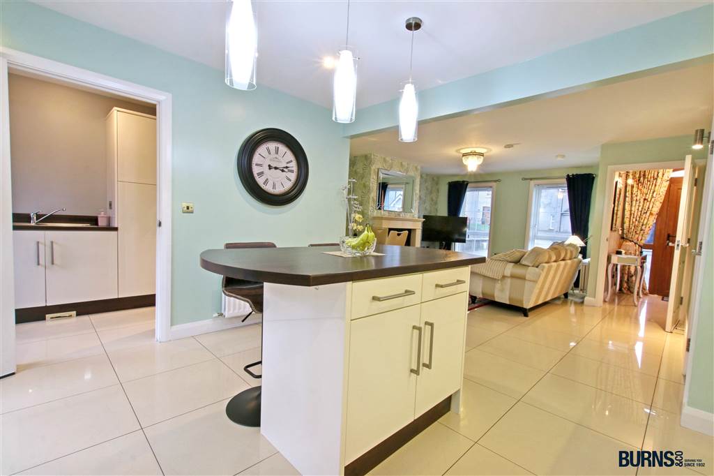 tiled floor; solid fuel fireplace with black granite hearth and marble surround; TV point; wall lights; understairs larder cupboard; attractive modern kitchen with eye and low-level units; integrated fridge/freezer; central island with breakfast bar and pendant lighting; electric oven, grill and hob with stainless steel extractor hood; sink and drainer; double doors leading to fully enclosed brick paved rear yard.