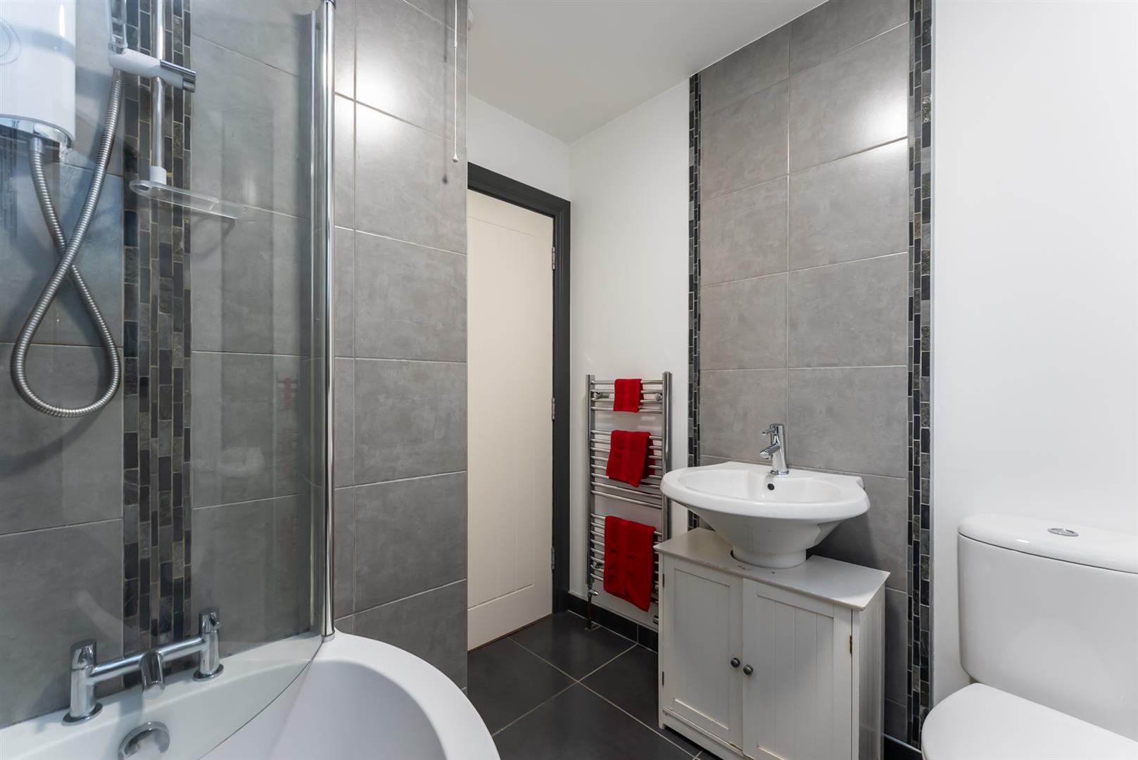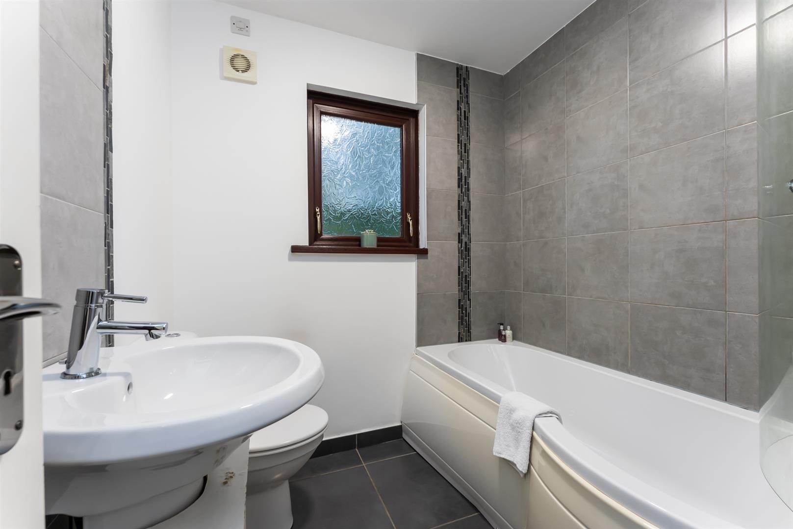 White suite comprising low flush w.c, wash hand basin and panel bath with overhead shower. Fully tiled.