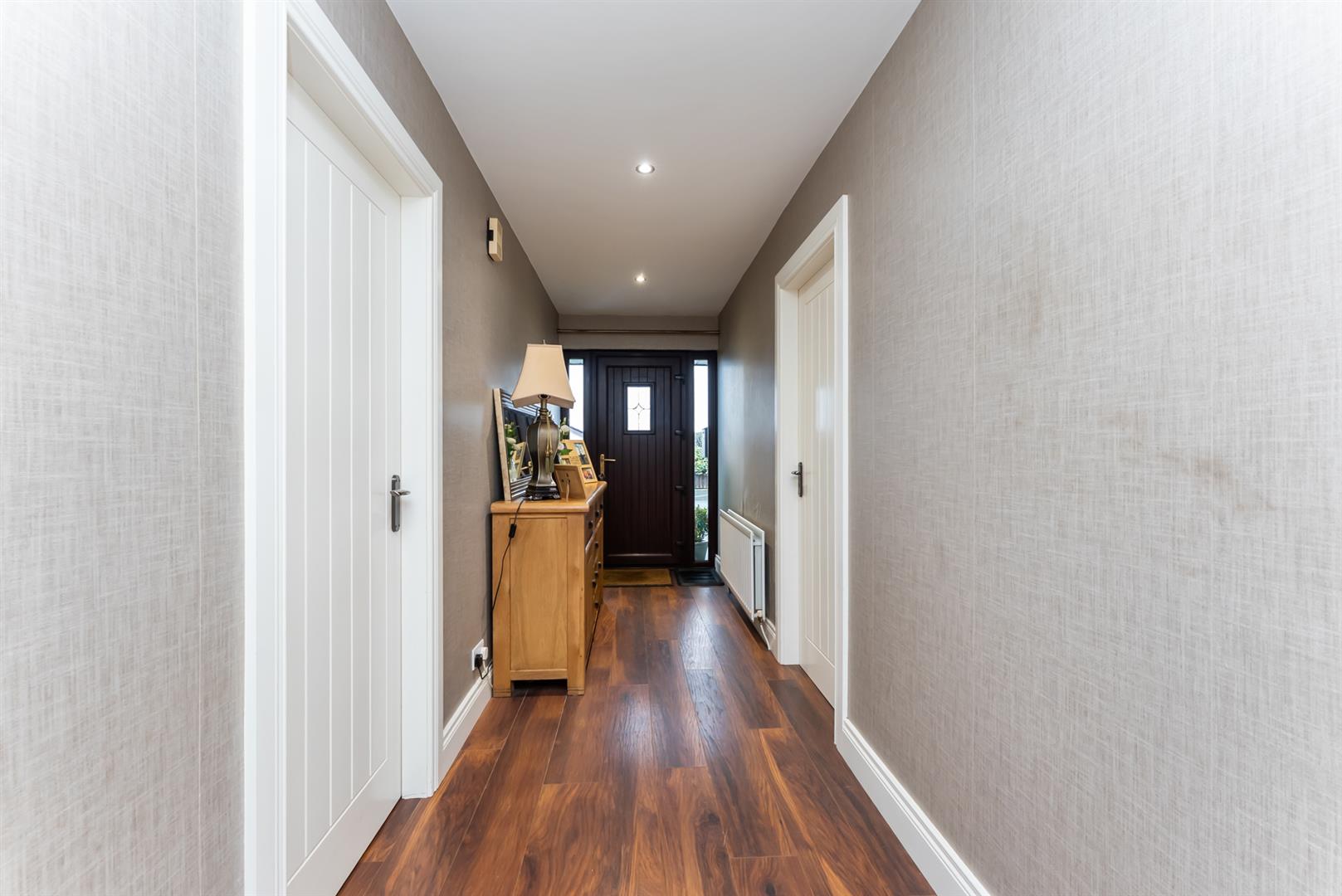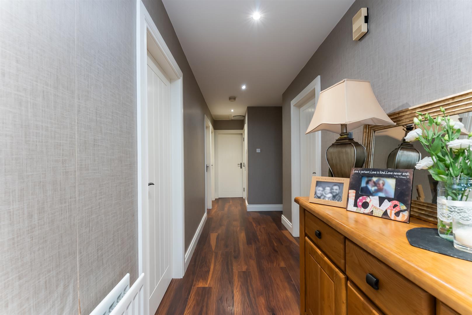 Pvc glazed front door to entrance hall with wooden laminate flooring and large walk in hotpress.