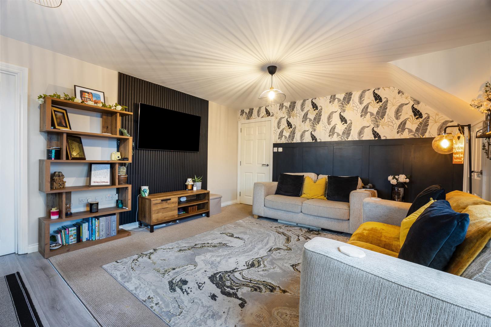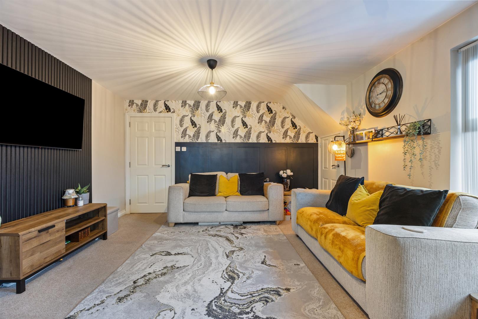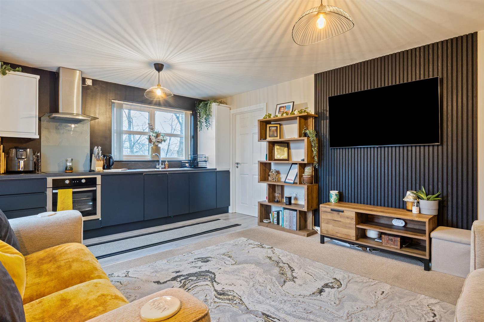 Bright and spacious open plan living with sitting area with feature wall paneling and media wall. Kitchen with range of high and low rise units with integrated sink and drainer. Electric oven and hob with stainless steel overhead extractor fan. Integrated fridge/freezer and washer/dryer. Access to storage cupboard.